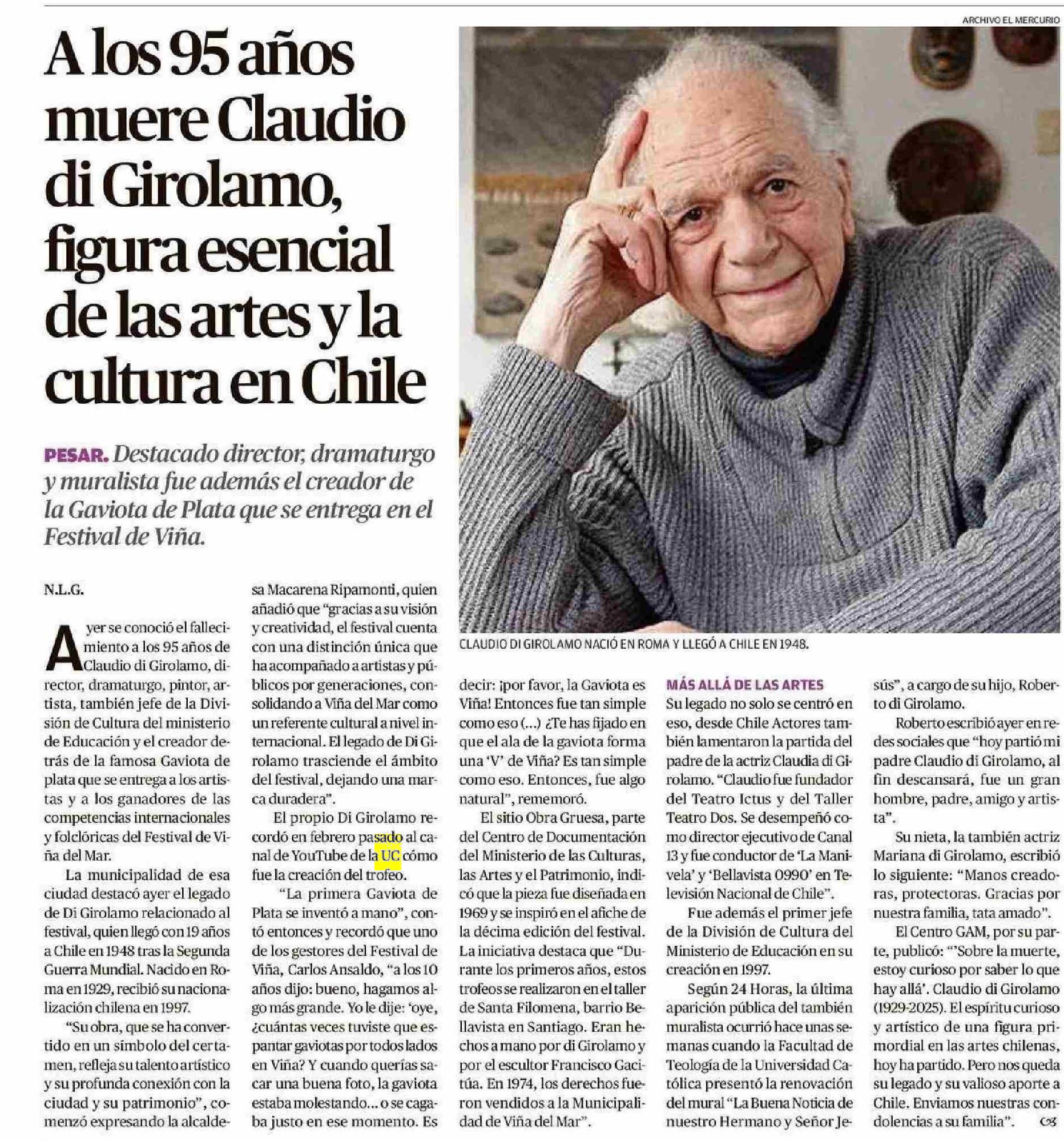 Título: Alos 95 años muere Claudio di Girolamo, figura esencial de las artes y la cultura en Chile