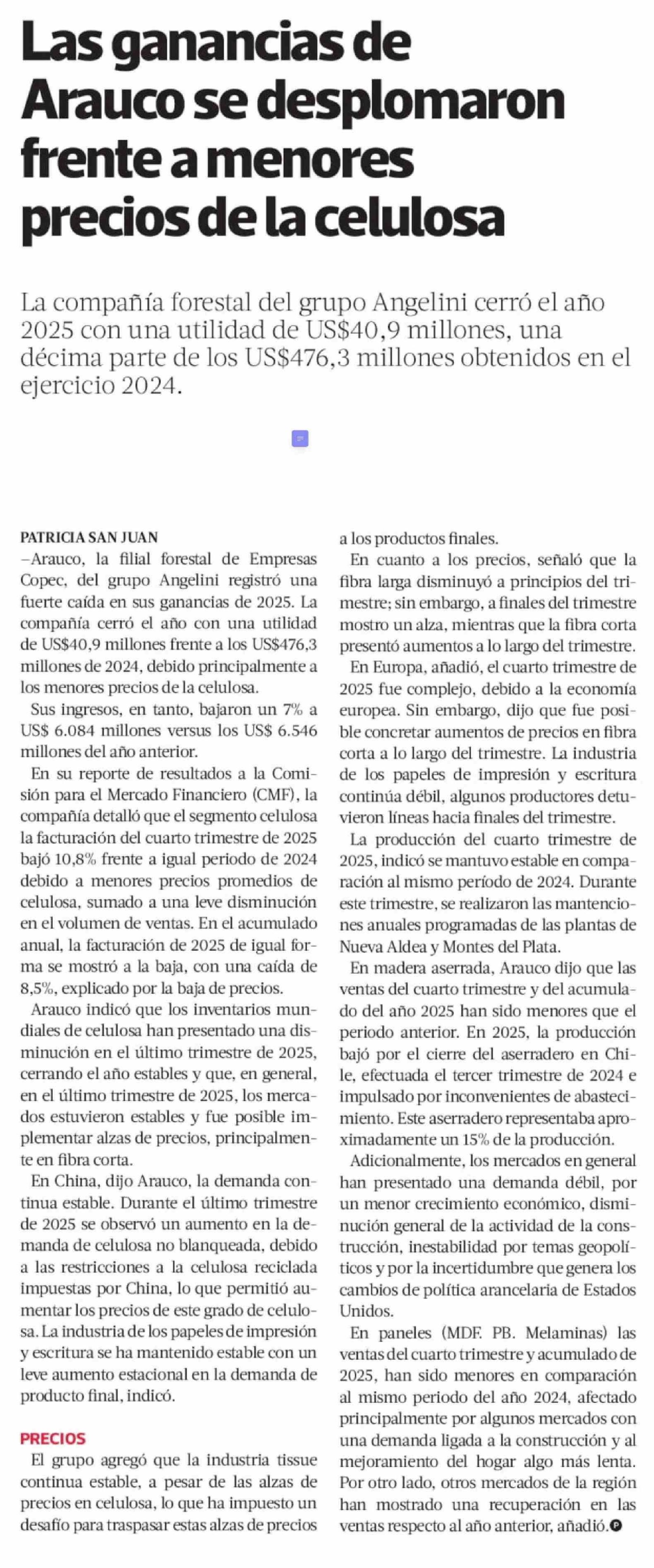 Título: Las ganancias de Arauco se desplomaron frente a menores precios de la celulosa