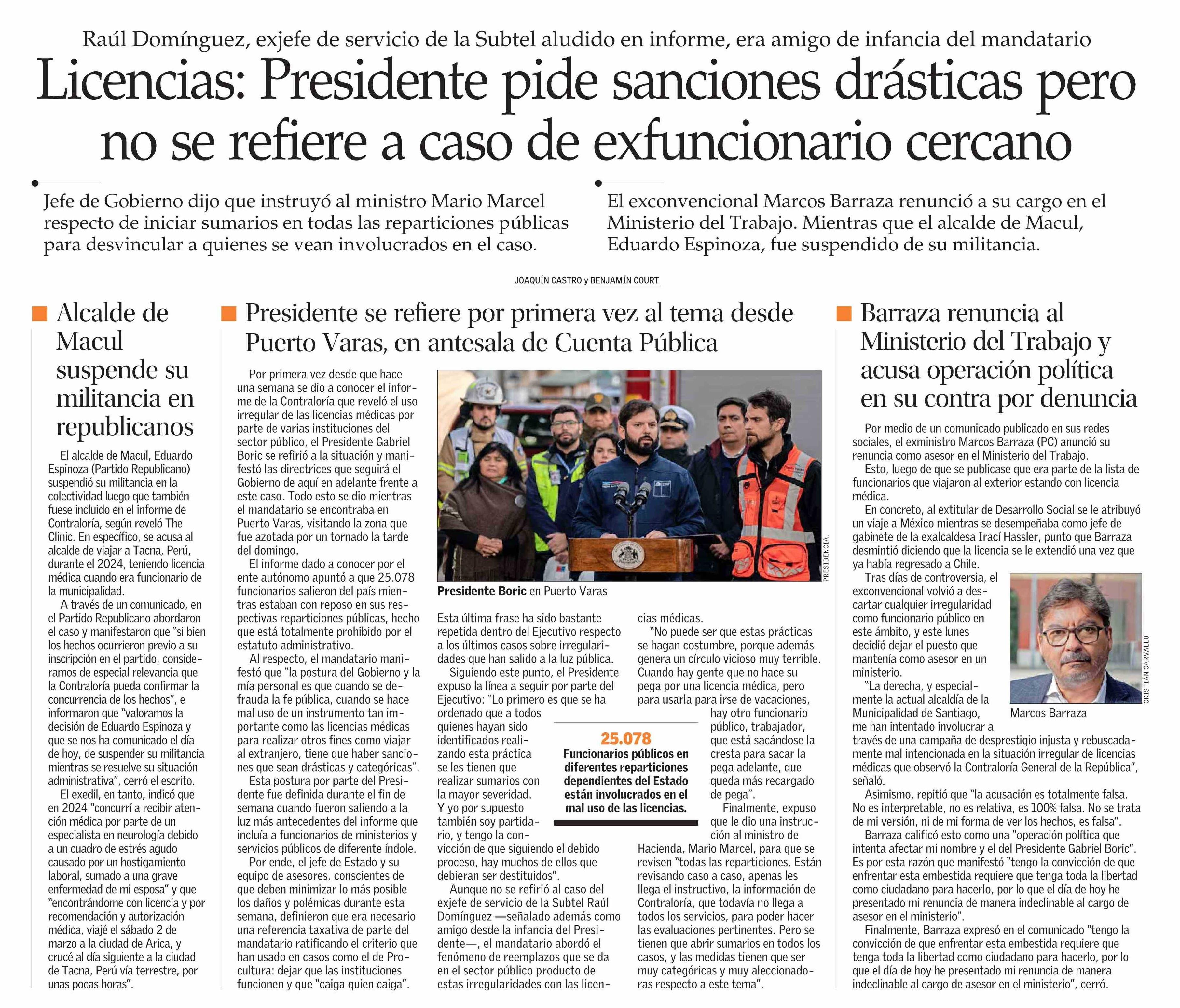 Licencias: Presidente pide sanciones drásticas pero no se refiere a caso de exfuncionario cercano 27-05-2025 El Mercurio |