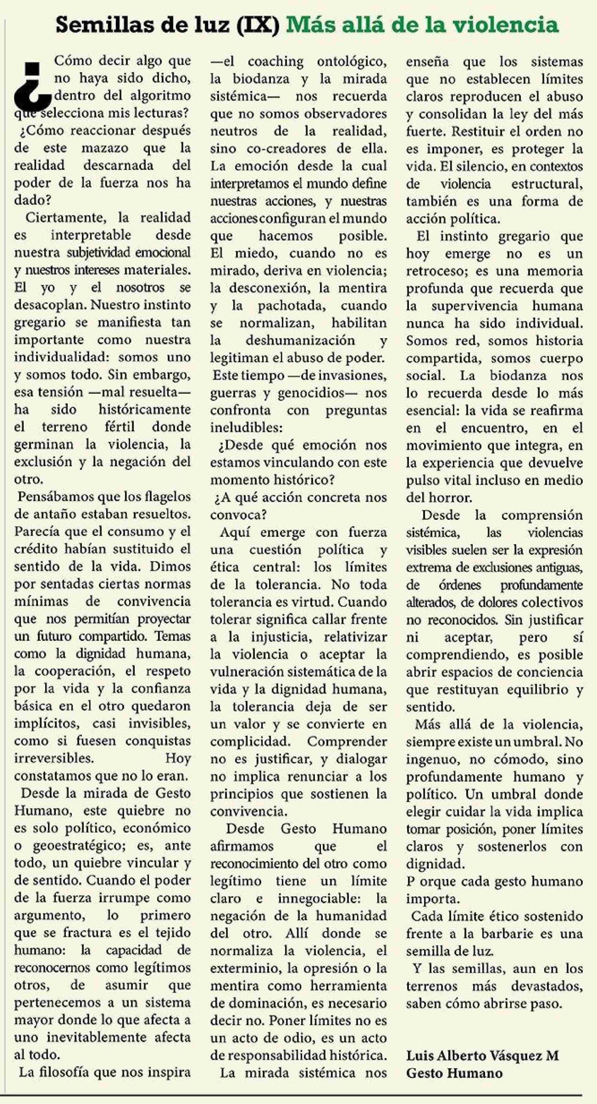 Columnas de Opinión: Semillas de luz (IX) Más allá de la violencia 21-01-2026 El Heraldo Austral |
