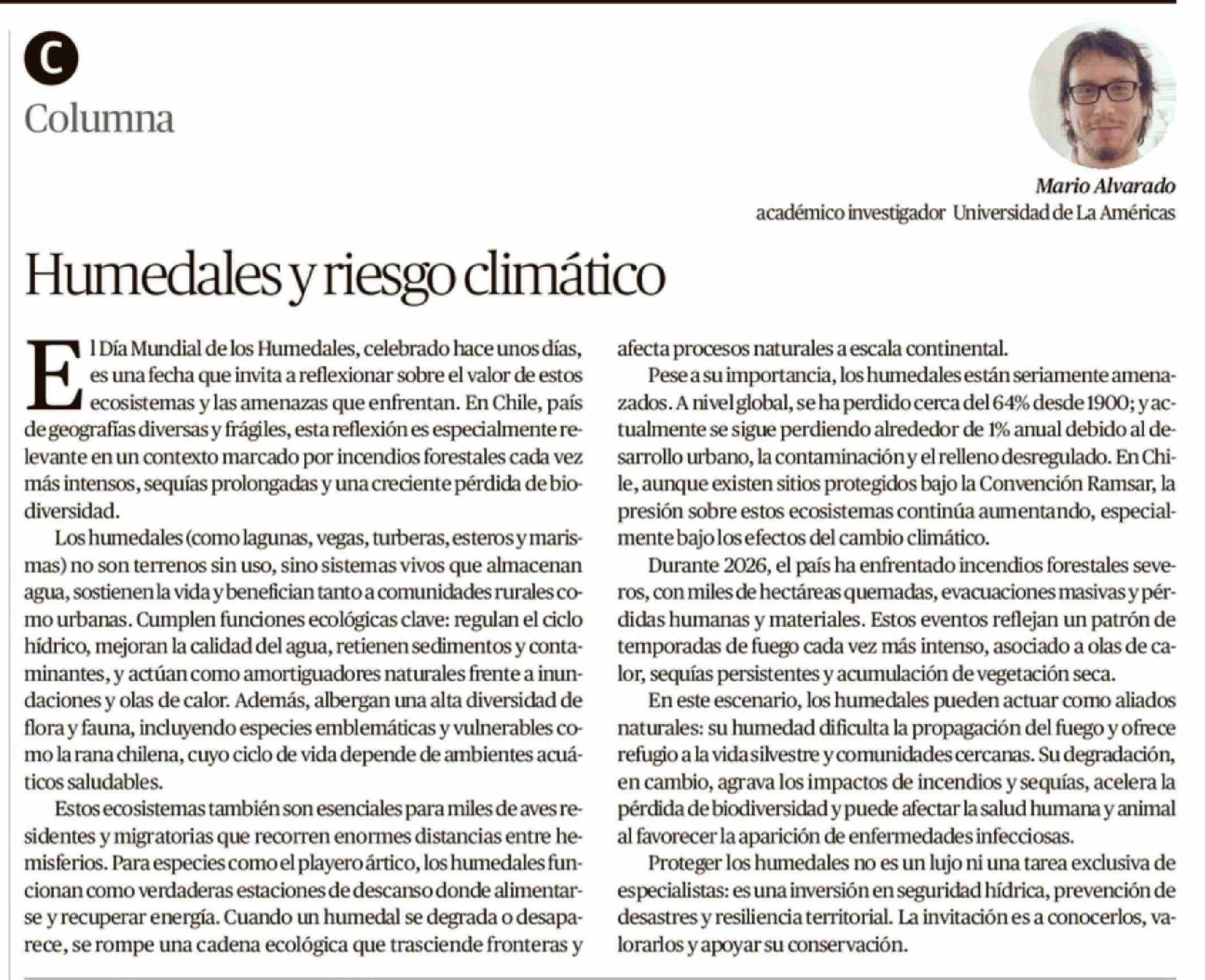 Columnas de Opinión: Humedales y riesgo climático 16-02-2026 El Austral de Osorno |