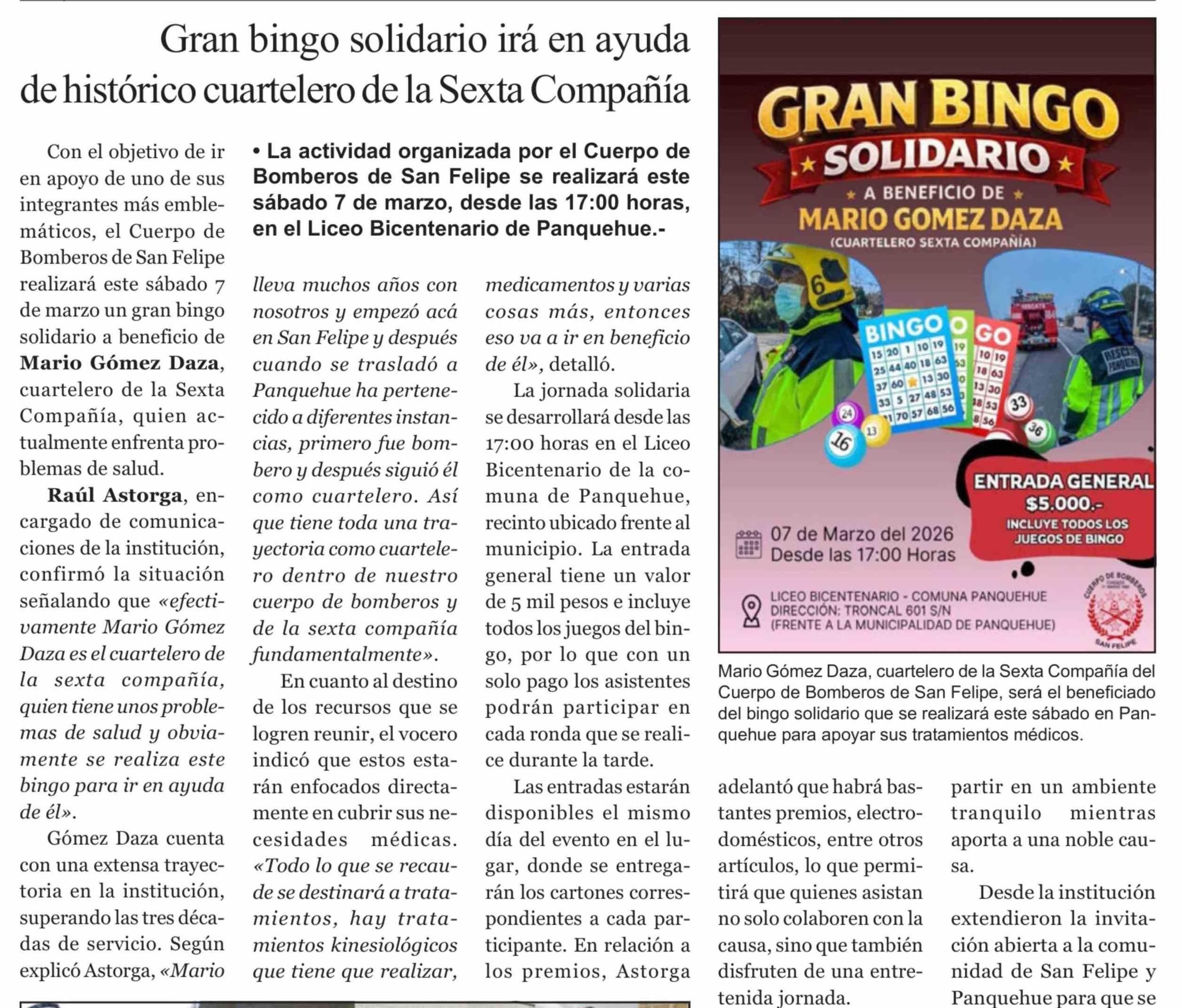Título: Gran bingo solidario irá en ayuda de histórico cuartelero de la Sexta Compañía