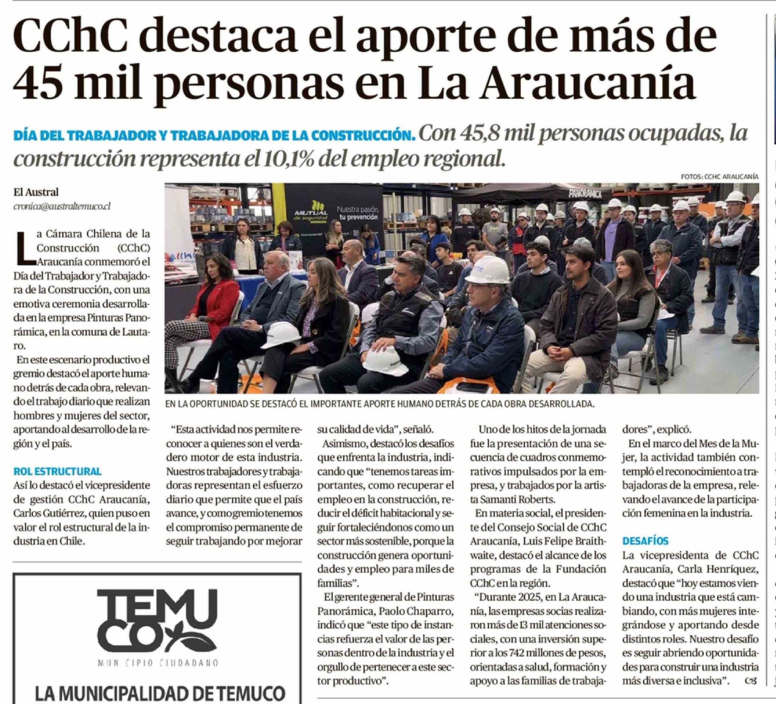 CChC destaca el aporte de más de 45 mil personas en La Araucanía 05-04-2026 El Austral de la Araucanía |