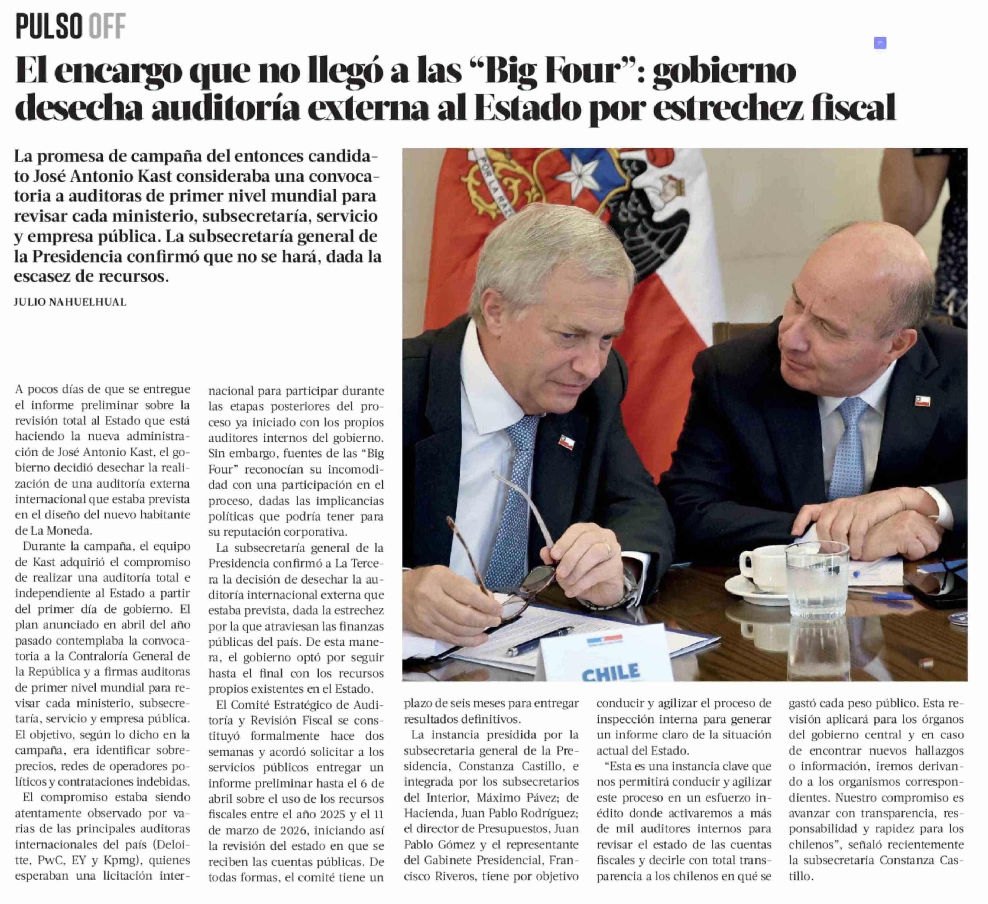 Título: El encargo que no llegó a las "Big Four": gobierno desecha auditoría externa al Estado por estrechez fiscal