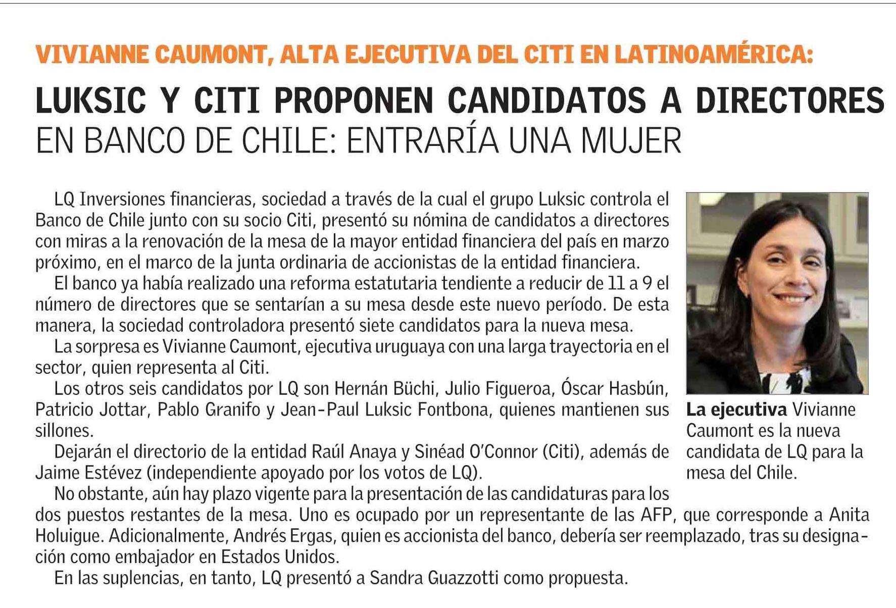 Título: LUKSIC Y CITI PROPONEN CANDIDATOS A DIRECTORES EN BANCO DE CHILE: ENTRARÍA UNA MUJER