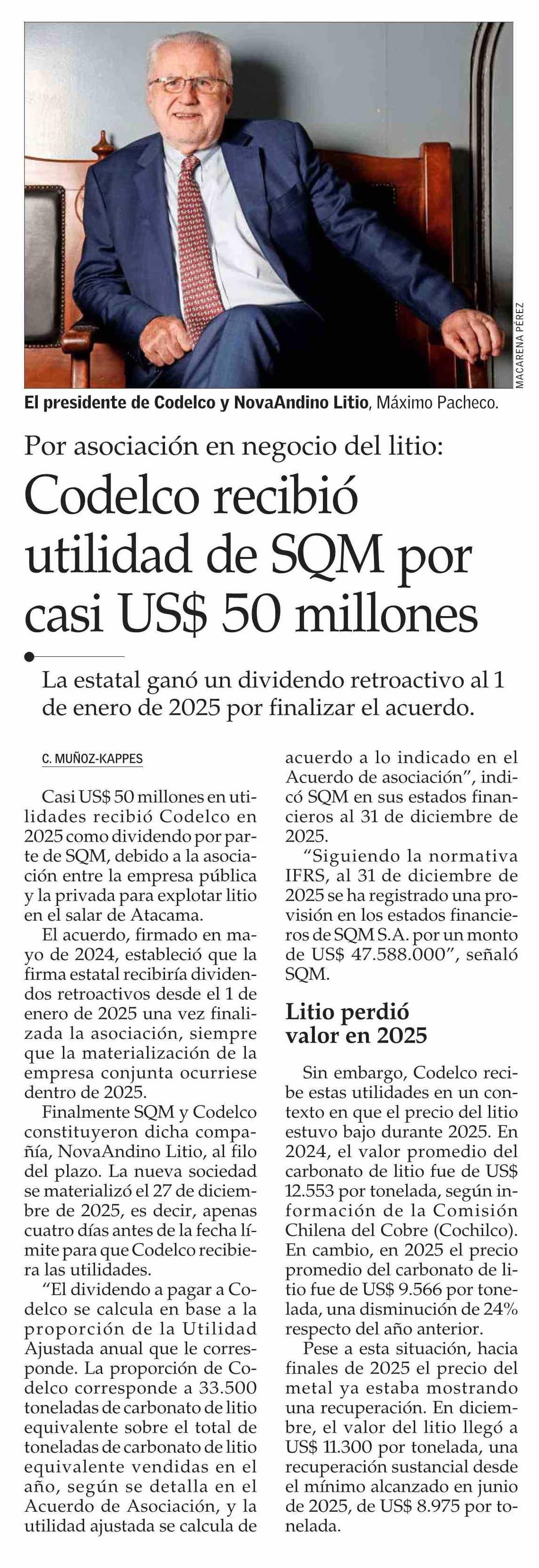 Codelco recibió utilidad de SQM por casi US$ 50 millones 04-03-2026 El Mercurio |