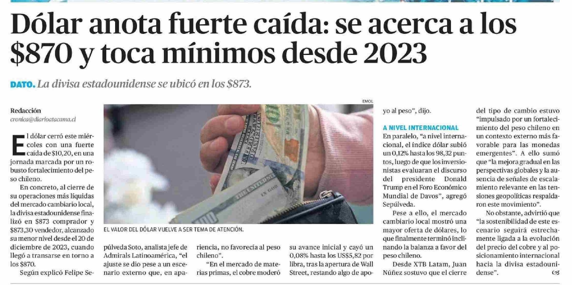 Dólar anota fuerte caída: se acerca a los $870 y toca mínimos desde 2023 22-01-2026 El Diario de Atacama |