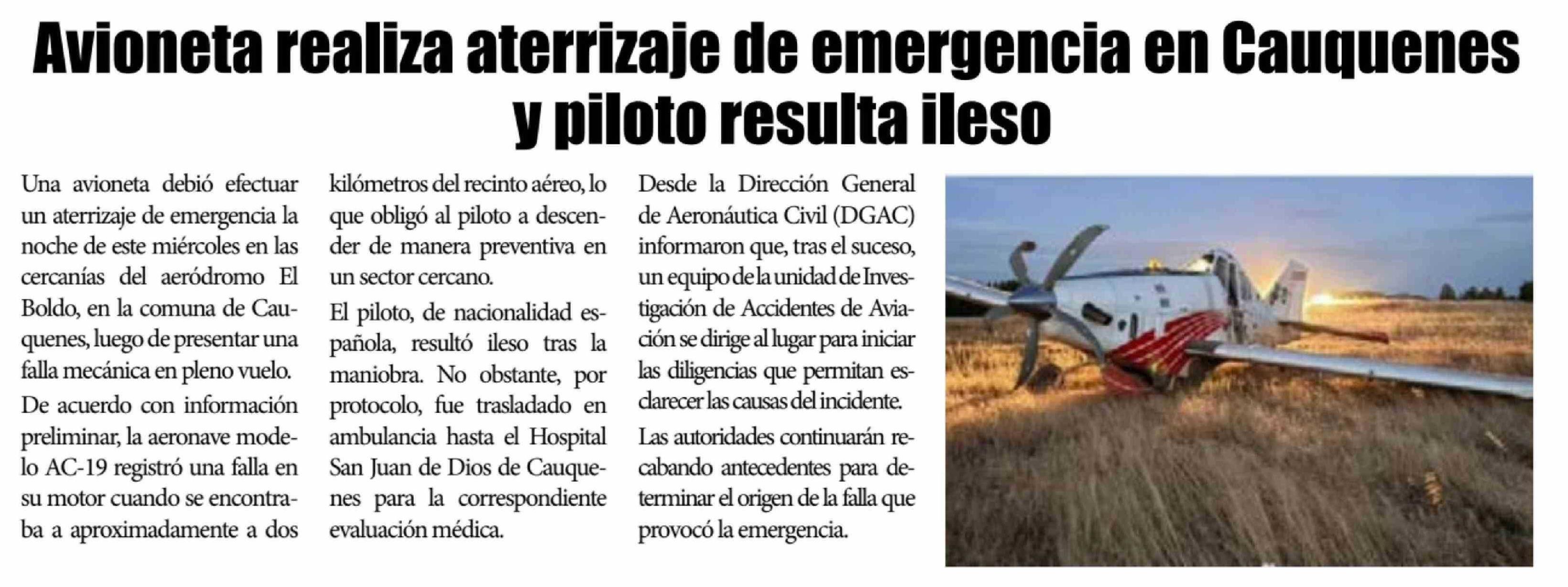 Título: Avioneta realiza aterrizaje de emergencia en Cauquenes y piloto resulta ileso