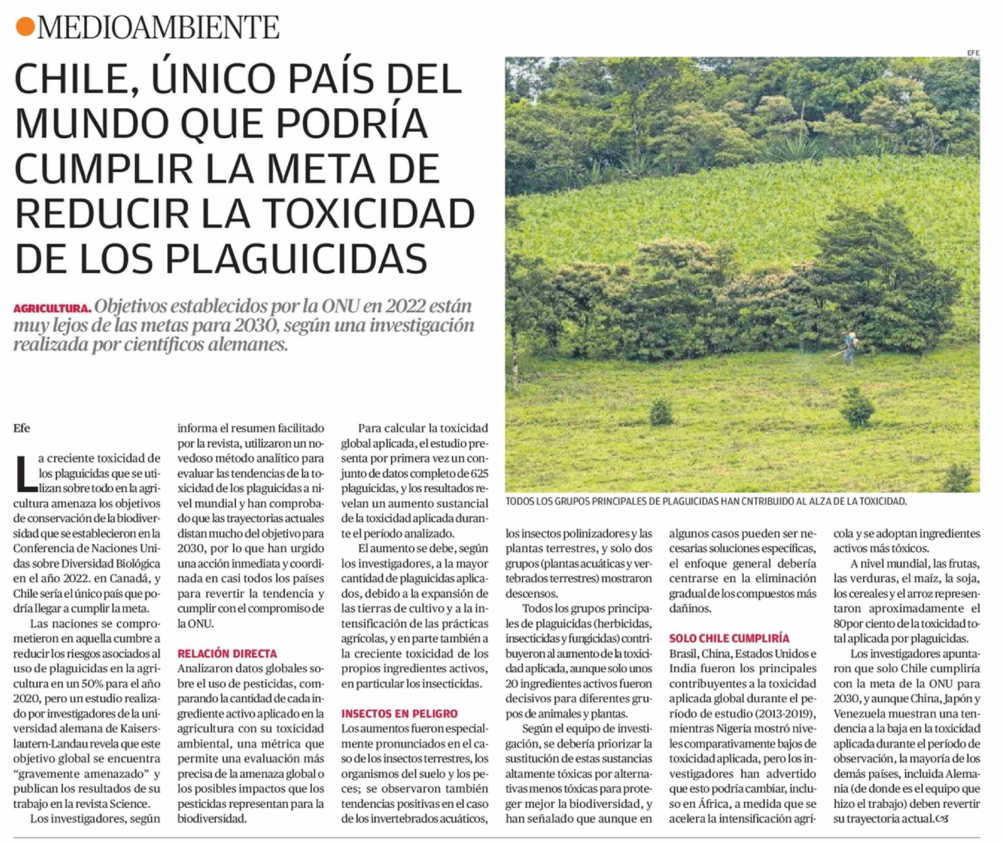 CHILE, ÚNICO PAÍS DEL MUNDO QUE PODRÍA CUMPLIR LA META DE REDUCIR LA TOXICIDAD DE LOS PLAGUICIDAS 10-02-2026 El Mercurio de Antofagasta |