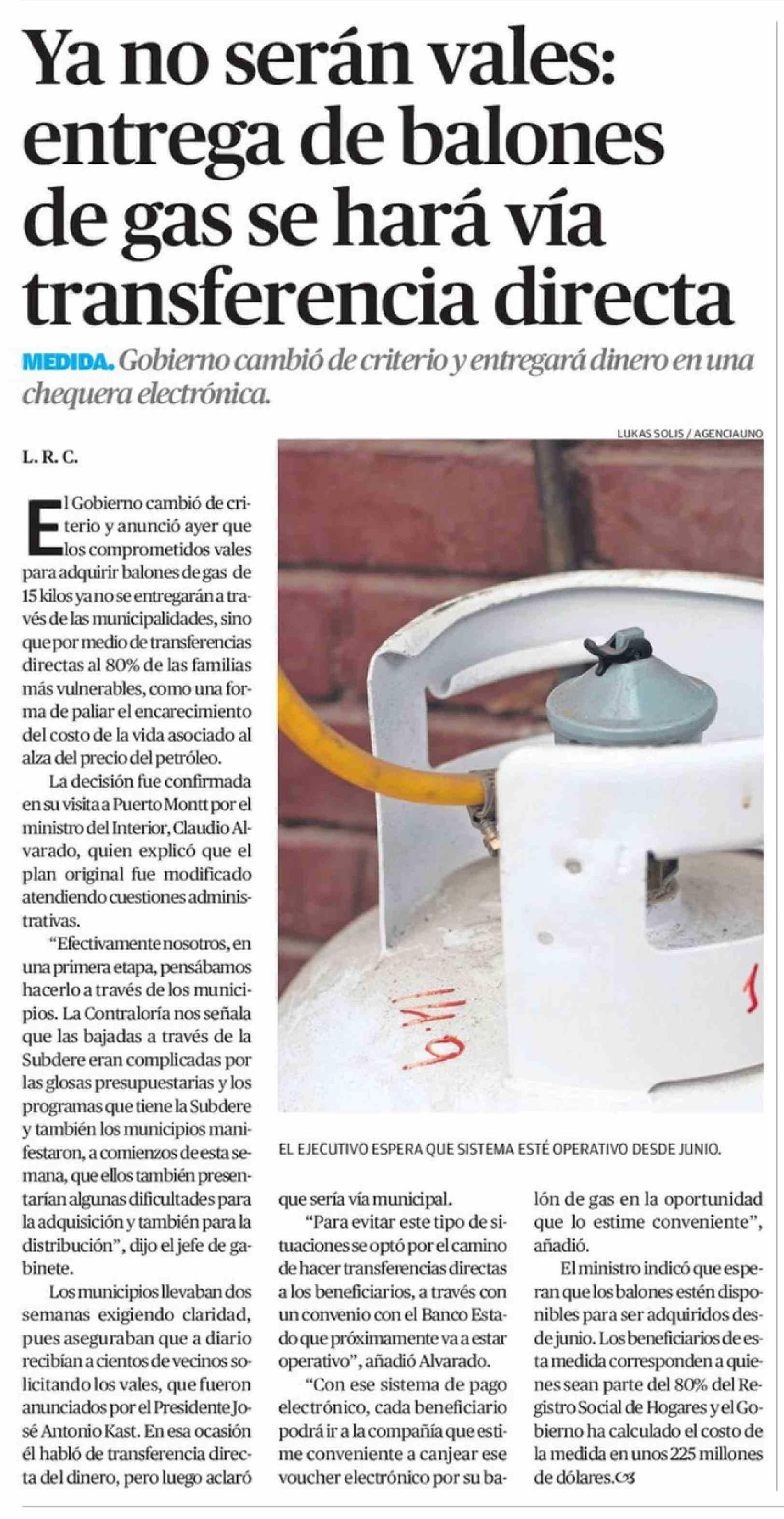 Ya no serán vales: entrega de balones de gas se hará vía transferencia directa 18-04-2026 El Mercurio de Antofagasta |