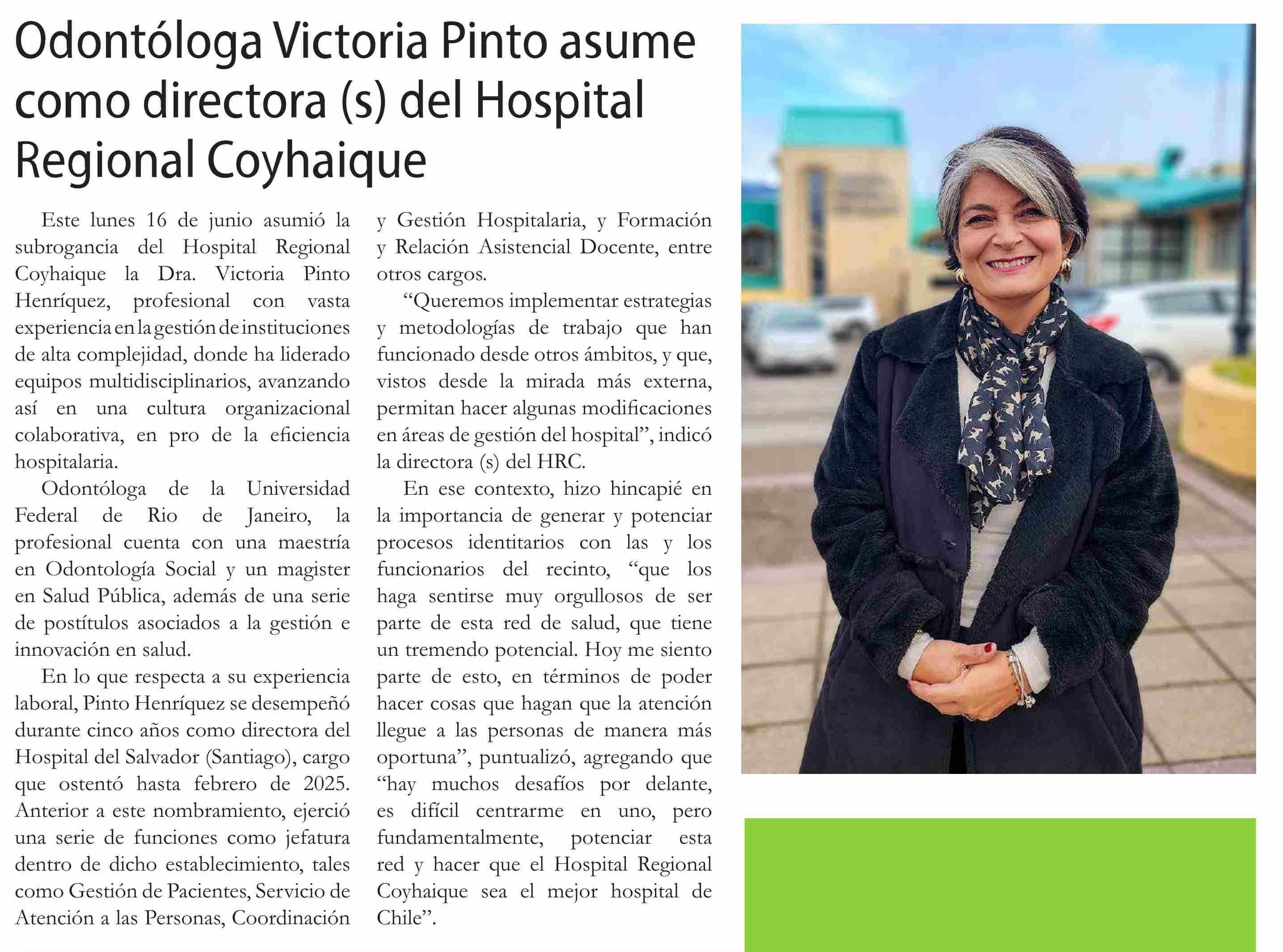 Odontóloga Victoria Pinto asume como directora (s) del Hospital Regional Coyhaique 17-06-2025 El Divisadero |