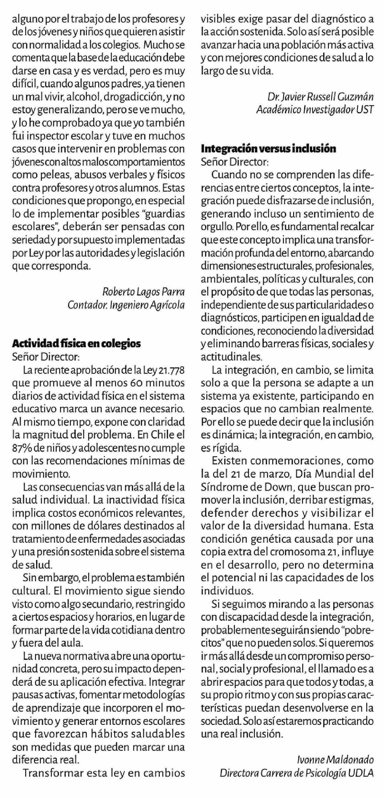 CARTAS: Actividad física en colegios 15-04-2026 La Discusión |