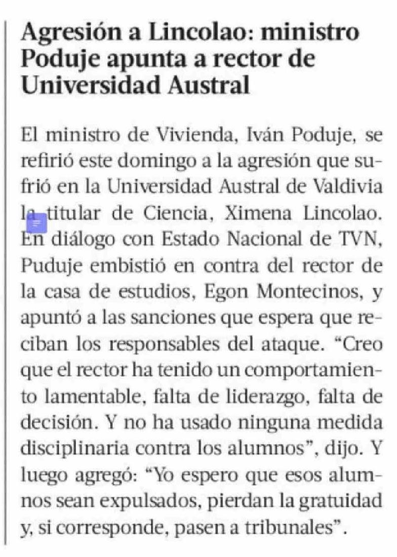 Título: Agresión a Lincolao: ministro Poduje apunta a rector de Universidad Austral
