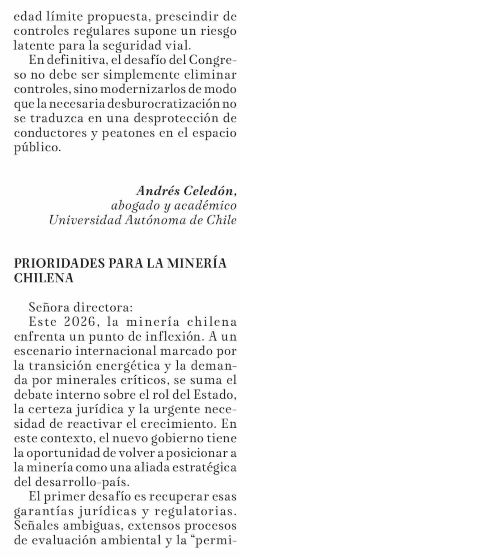 CARTAS: PRIORIDADES PARA LA MINERÍA CHILENA 19-01-2026 La Tribuna |