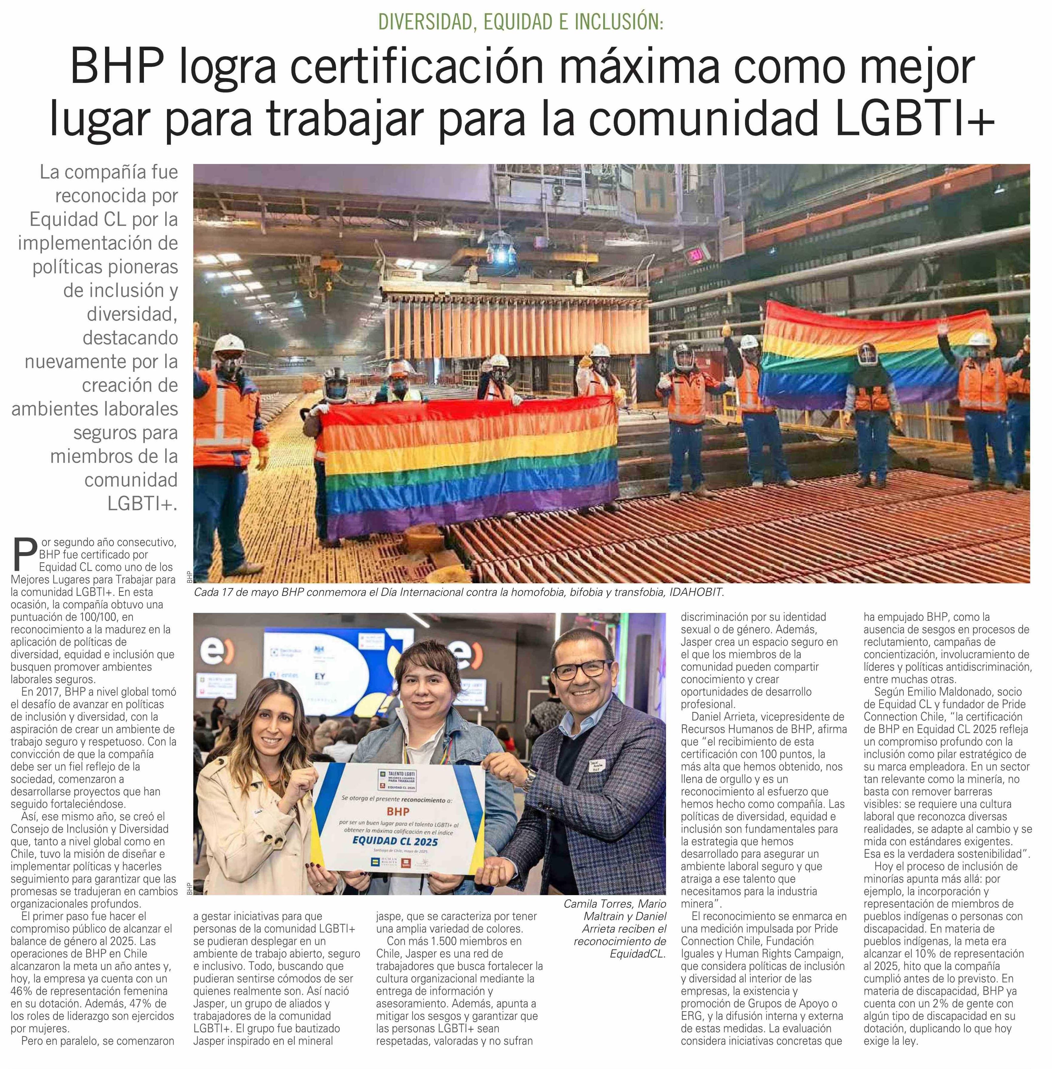 BHP logra certificación máxima como mejor lugar para trabajar para la comunidad LGBTI+ 28-05-2025 El Mercurio |
