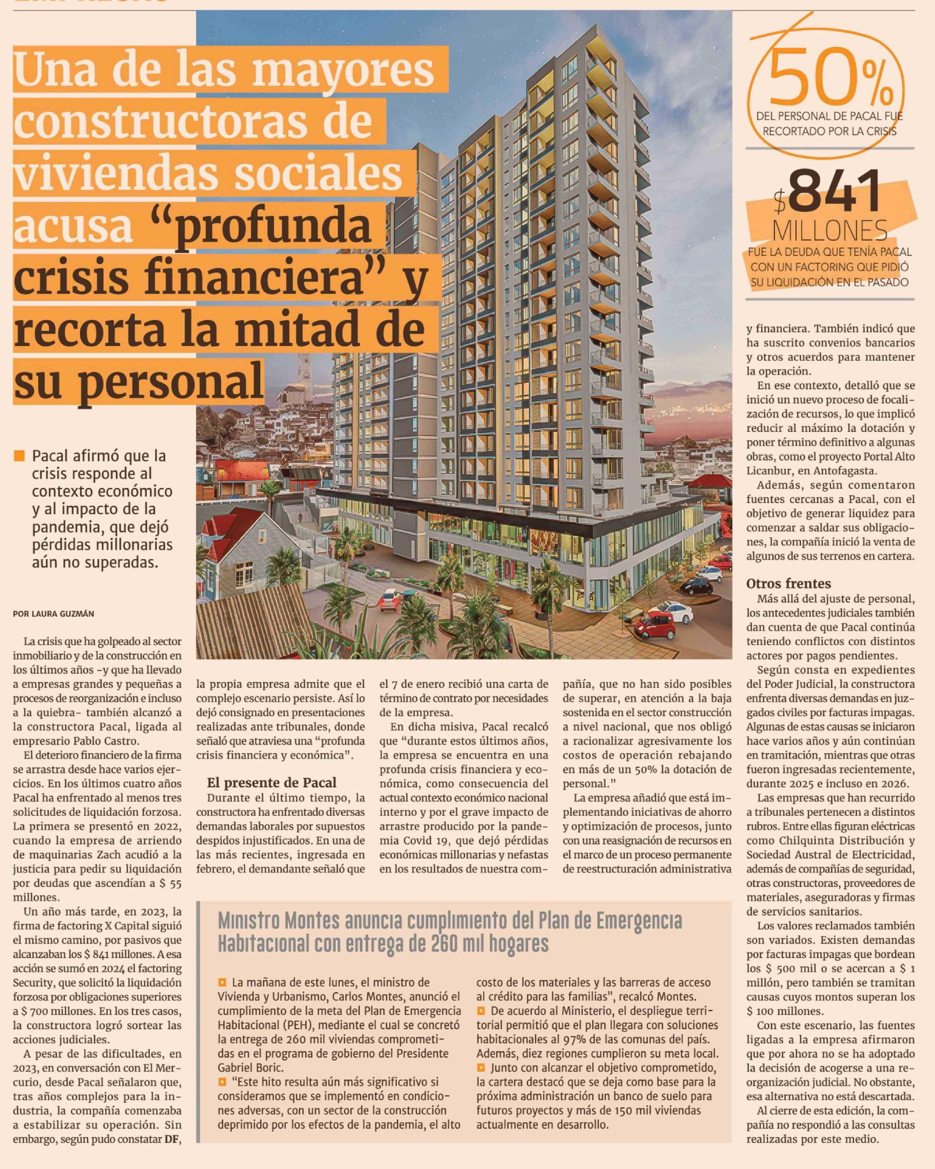 Una de las mayores constructoras de viviendas sociales acusa "profunda crisis financiera' y recorta la mitad de su personal 03-03-2026 Diario Financiero |