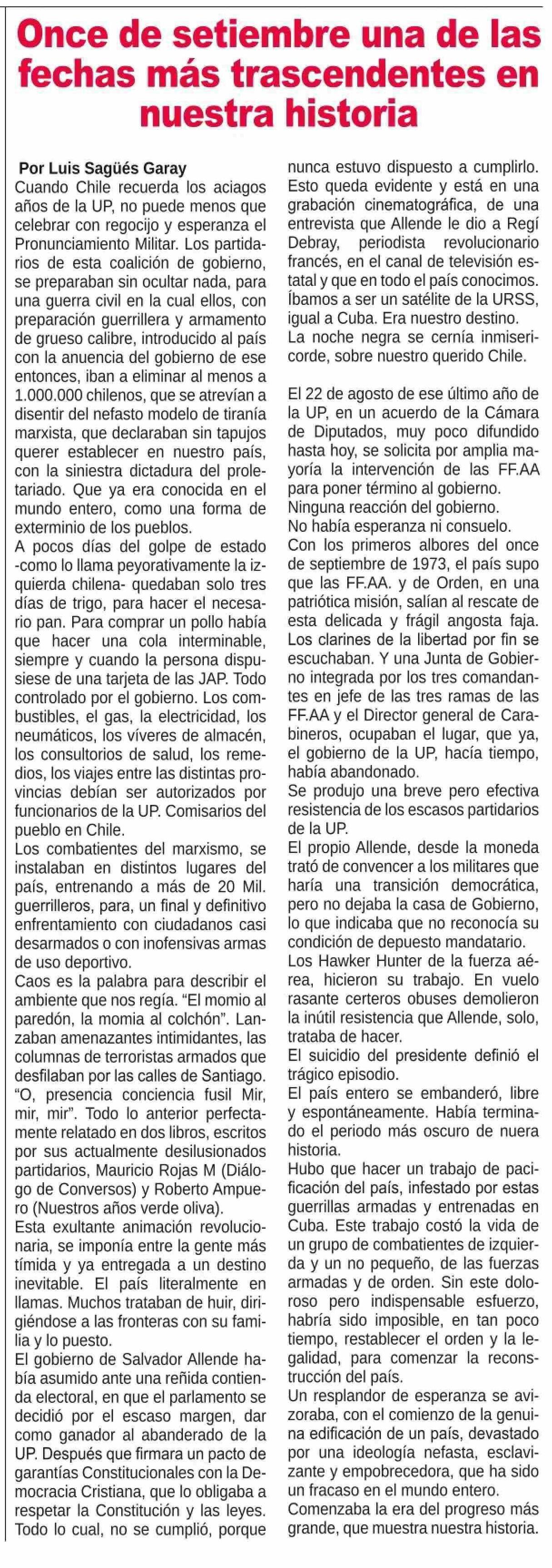 Once de setiembre una de las fechas más trascendentes en nuestra historia 13-09-2024 Buenos Días Curacaví |
