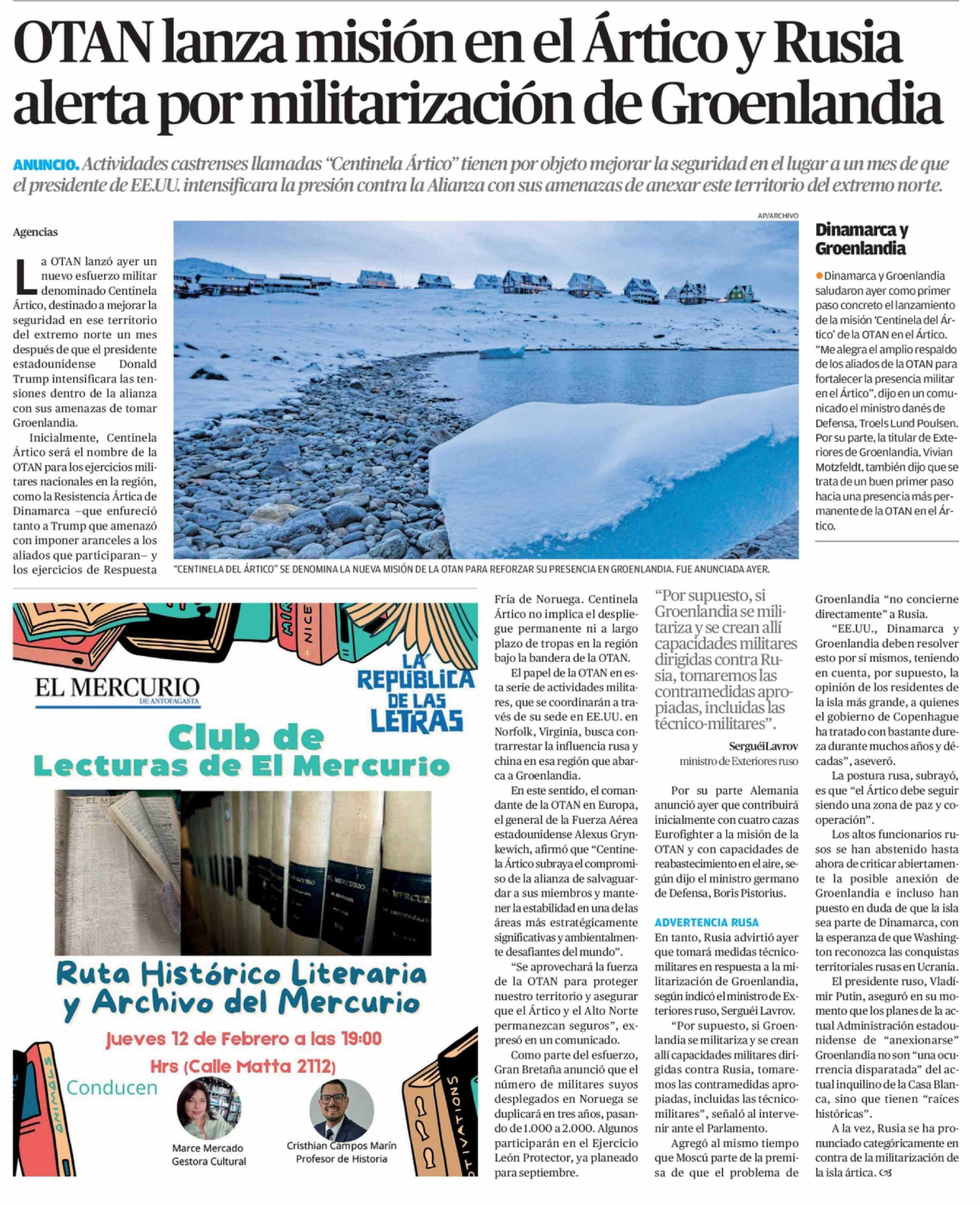 OTAN lanza misión en el Ártico y Rusia alerta por militarización de Groenlandia 12-02-2026 El Mercurio de Antofagasta |
