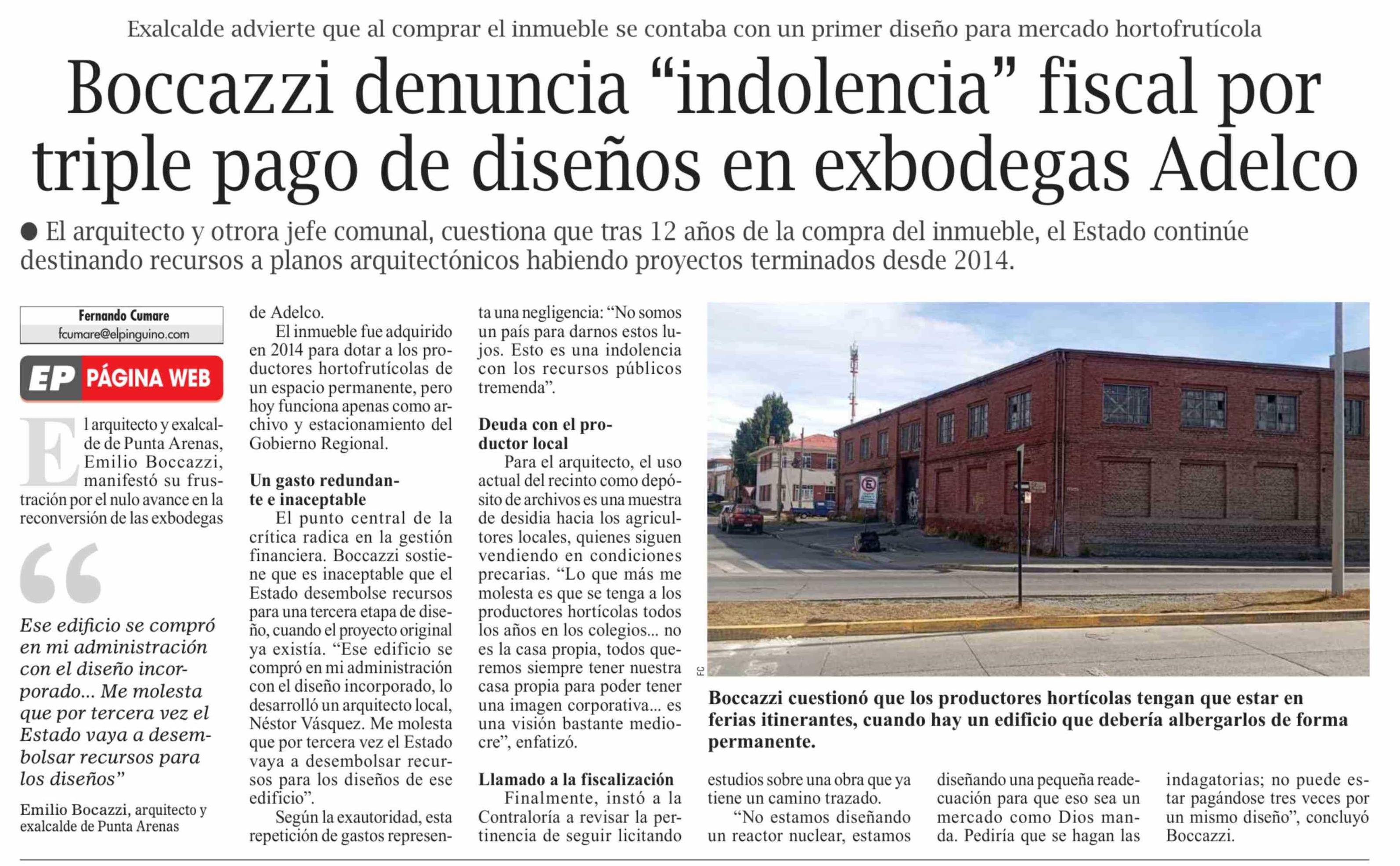 Boccazzi denuncia "indolencia" fiscal por triple pago de diseños en exbodegas Adelco 21-02-2026 El Pingüino |