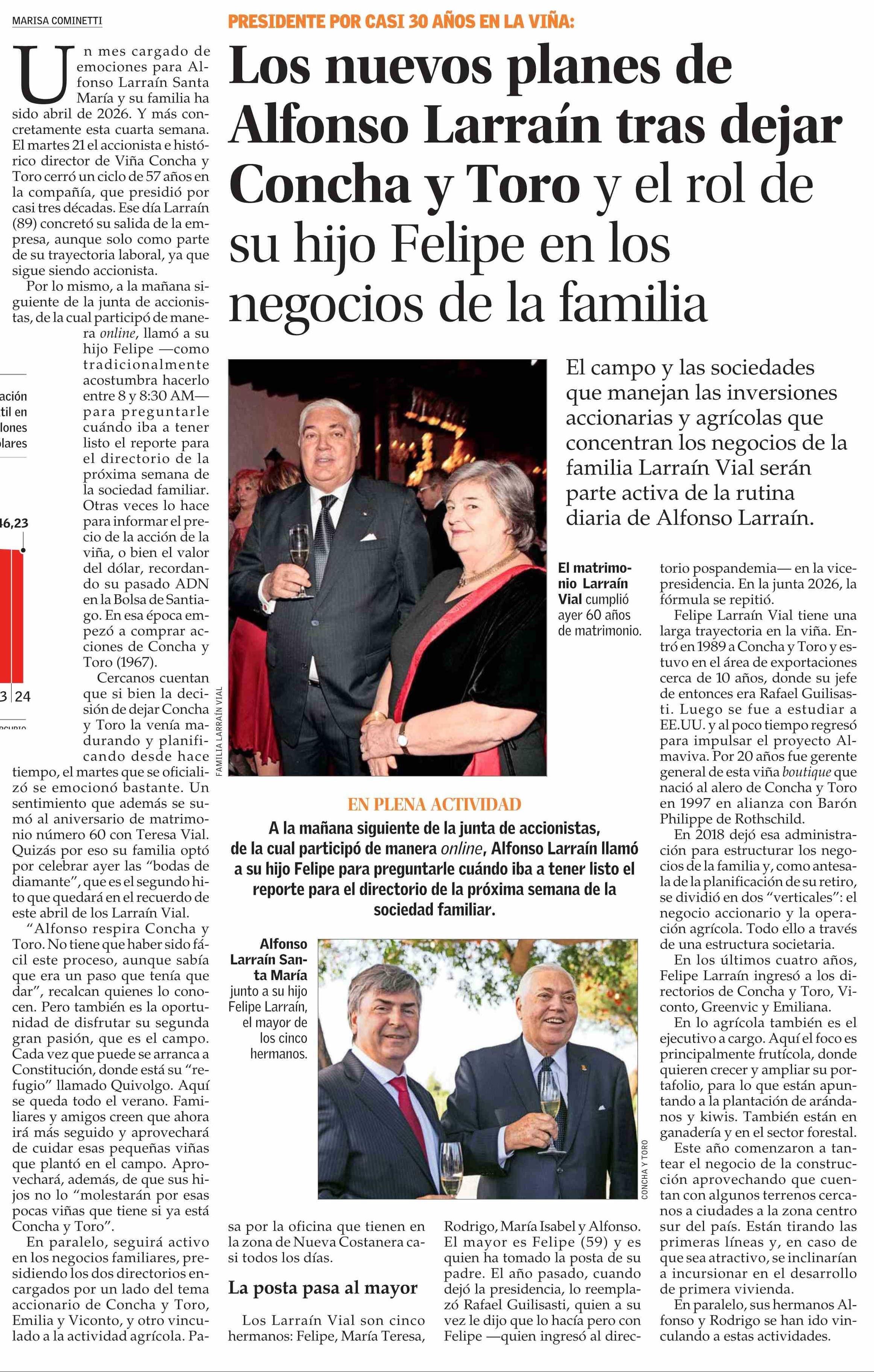 Los nuevos planes de Alfonso Larraín tras dejar Concha y Toro y el rol de su hijo Felipe en los negocios de la familia 25-04-2026 El Mercurio |
