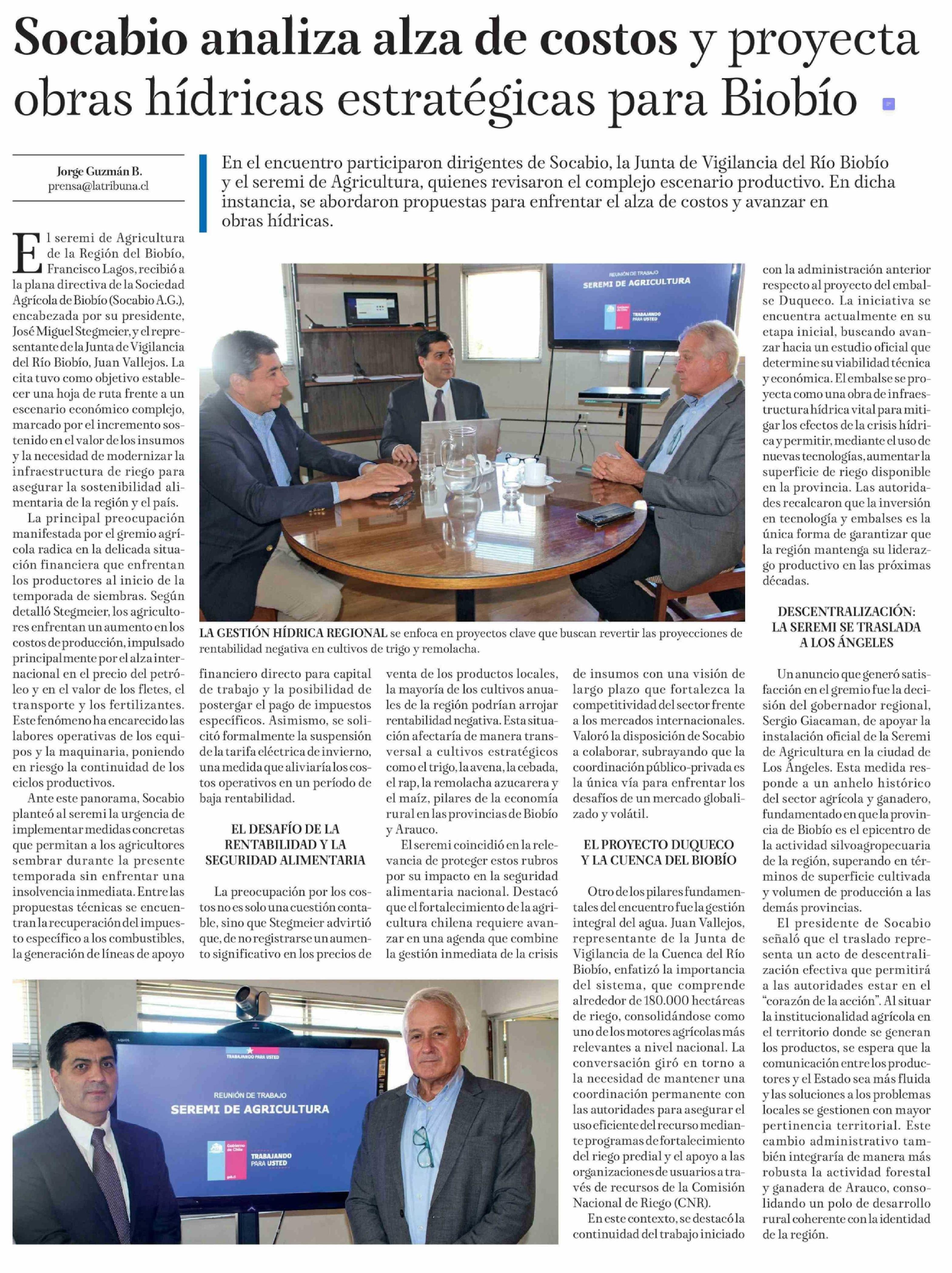 Socabio analiza alza de costos y proyecta obras hídricas estratégicas para Biobío 15-04-2026 La Tribuna |