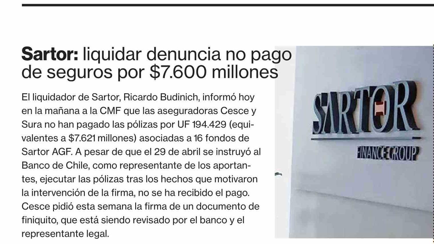 Sartor: liquidar denuncia no pago de seguros por $7.600 millones 04-06-2025 La Segunda |