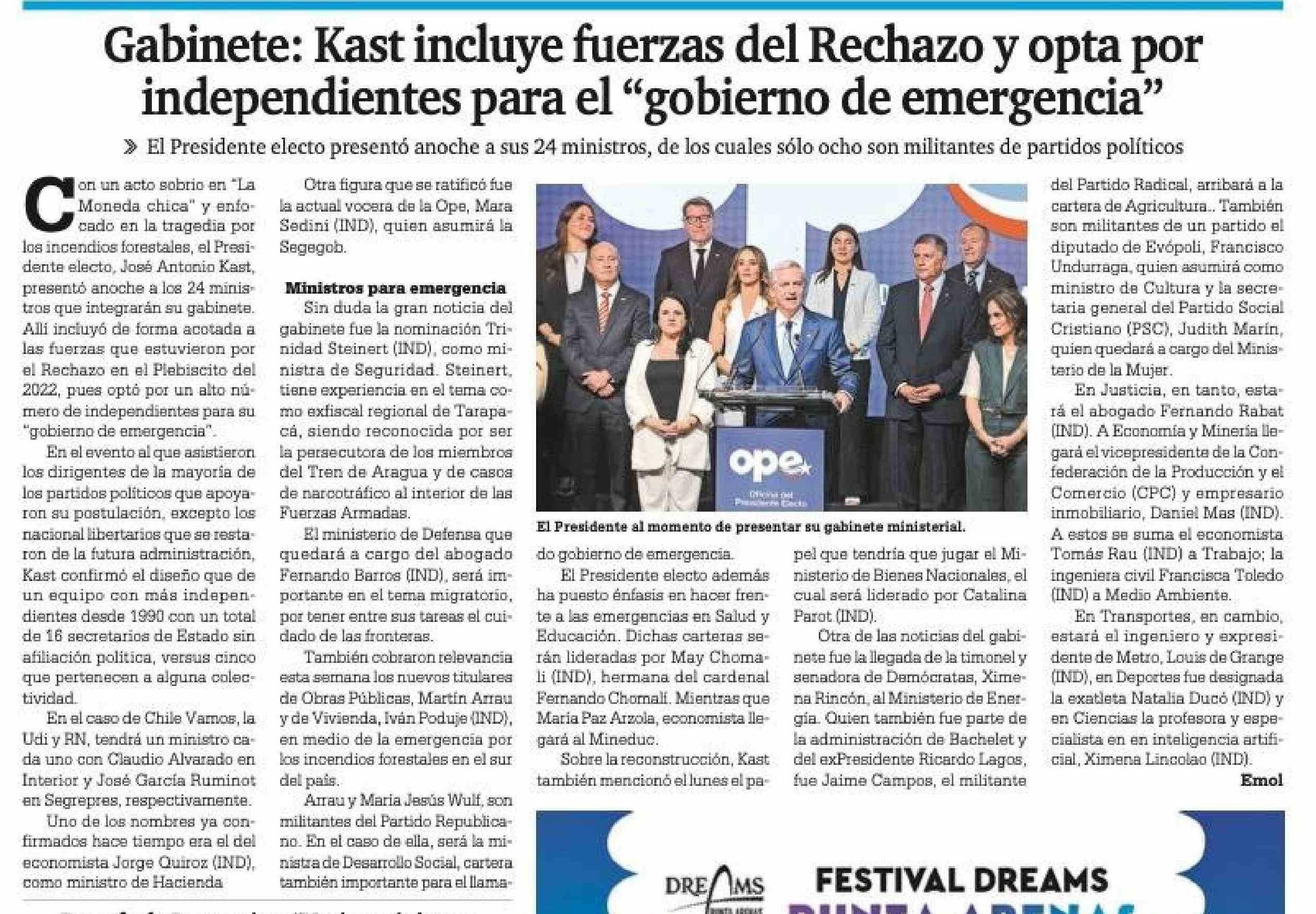 Gabinete: Kast incluye fuerzas del Rechazo y opta por independientes para el "gobierno de emergencia" 21-01-2026 La Prensa Austral |