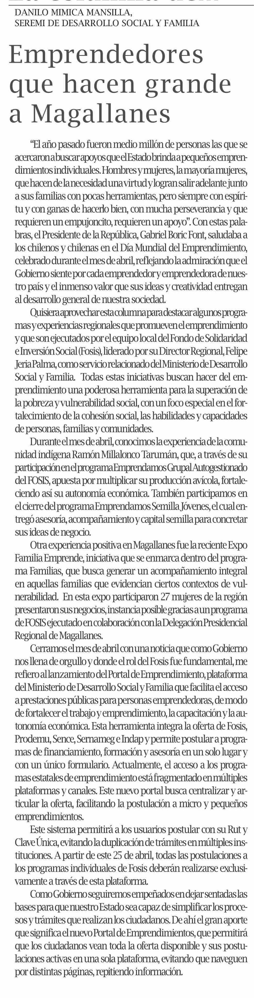 | Título: | Columnas de Opinión: Emprendedores que hacen grande a Magallanes |