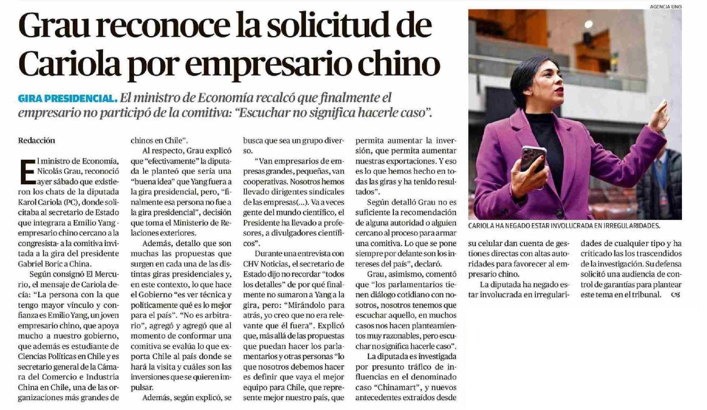 | Título: | Grau reconoce la solicitud de Cariola por empresario chino |