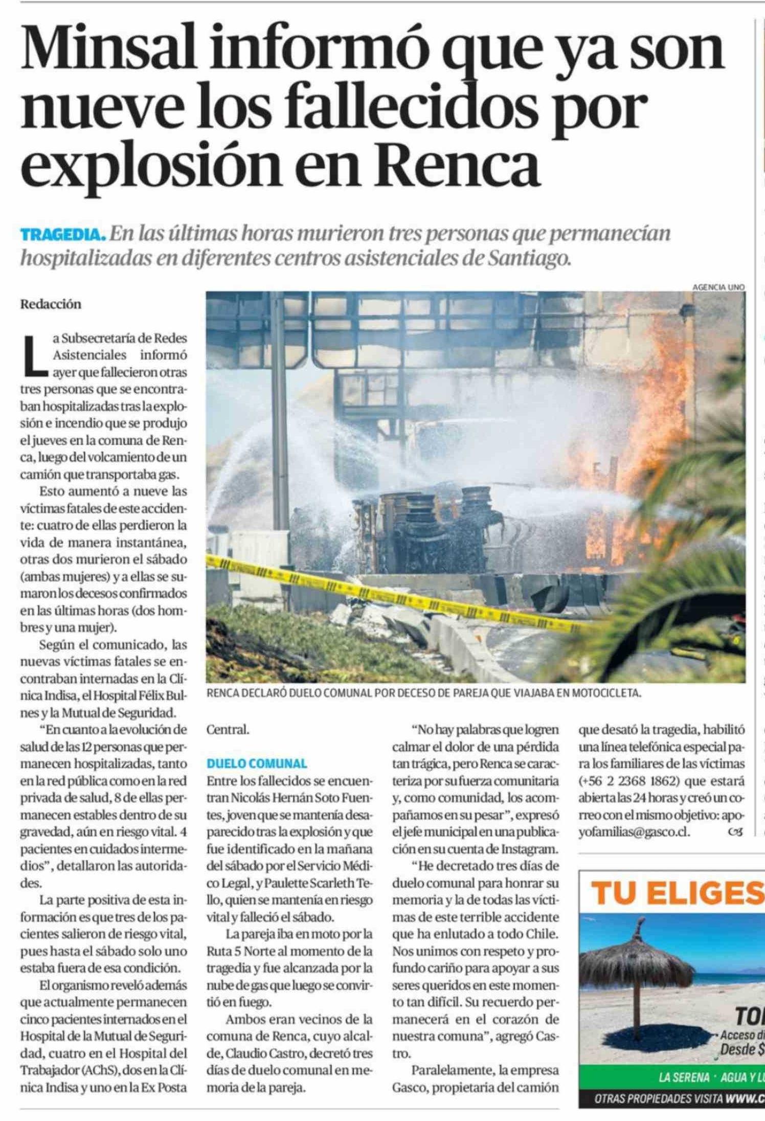 Título: Minsal informó que ya son nueve los fallecidos por explosión en Renca