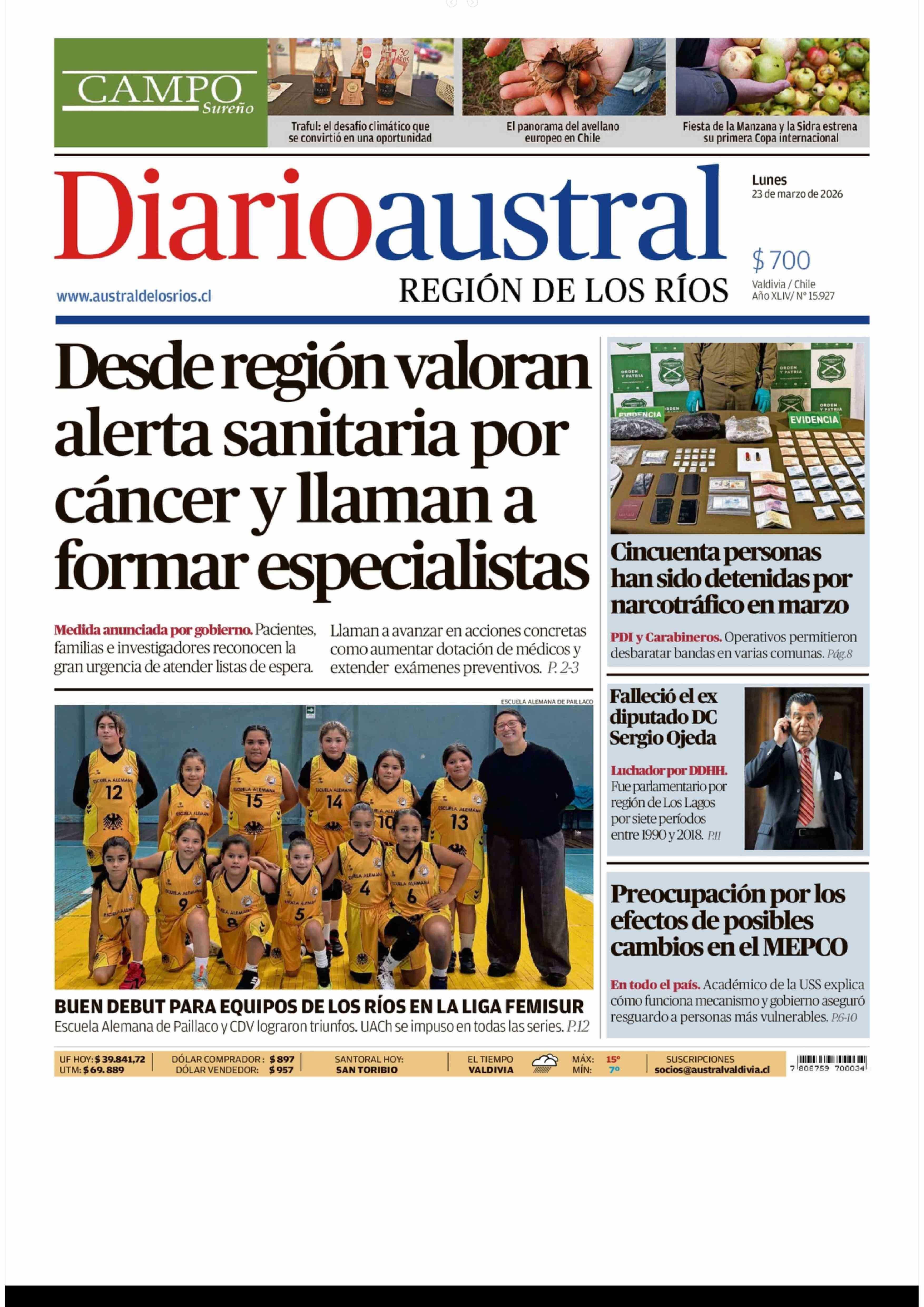 | Fecha: | 23-03-2026 | Sector: | Portada | Región: | Región de Los Ríos |