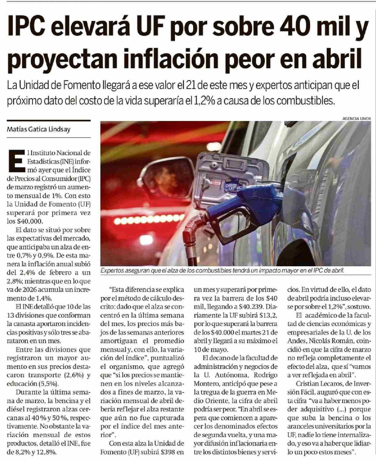 | Título: | IPC elevará UF por sobre 40 mil y proyectan inflación peor en abril |