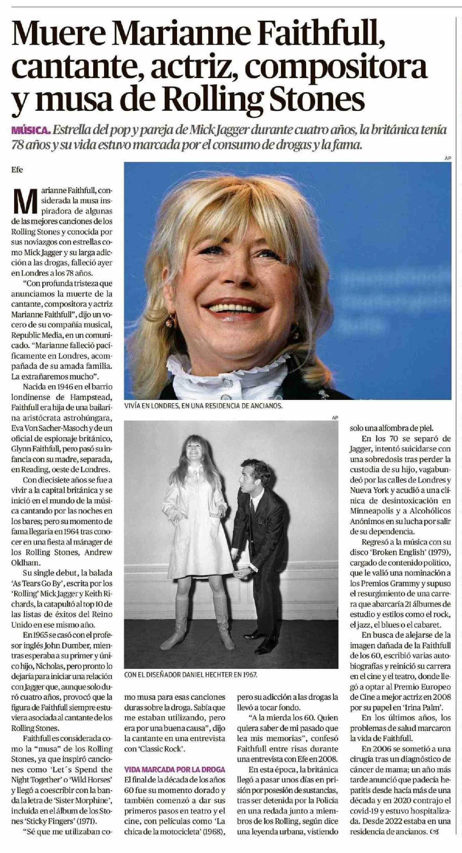 | Título: | Muere Marianne Faithfull, cantante, actriz, compositora y musa de Rolling Stones |