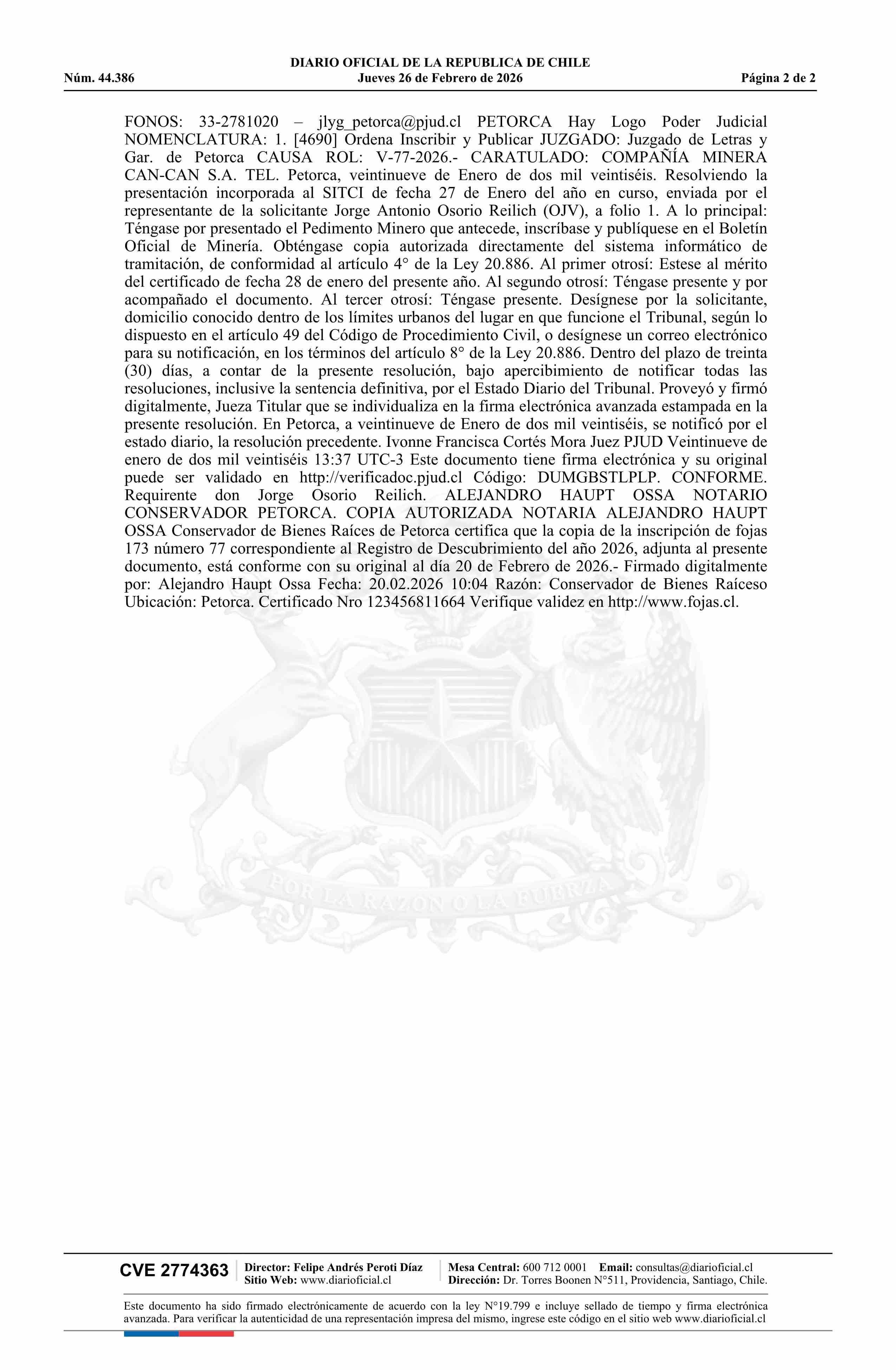TESORO 4 / Compañía Minera Can-Can S.A. 26-02-2026 DIARIO OFICIAL CHILE - BOLETÍN OFICIAL DE MINERÍA |