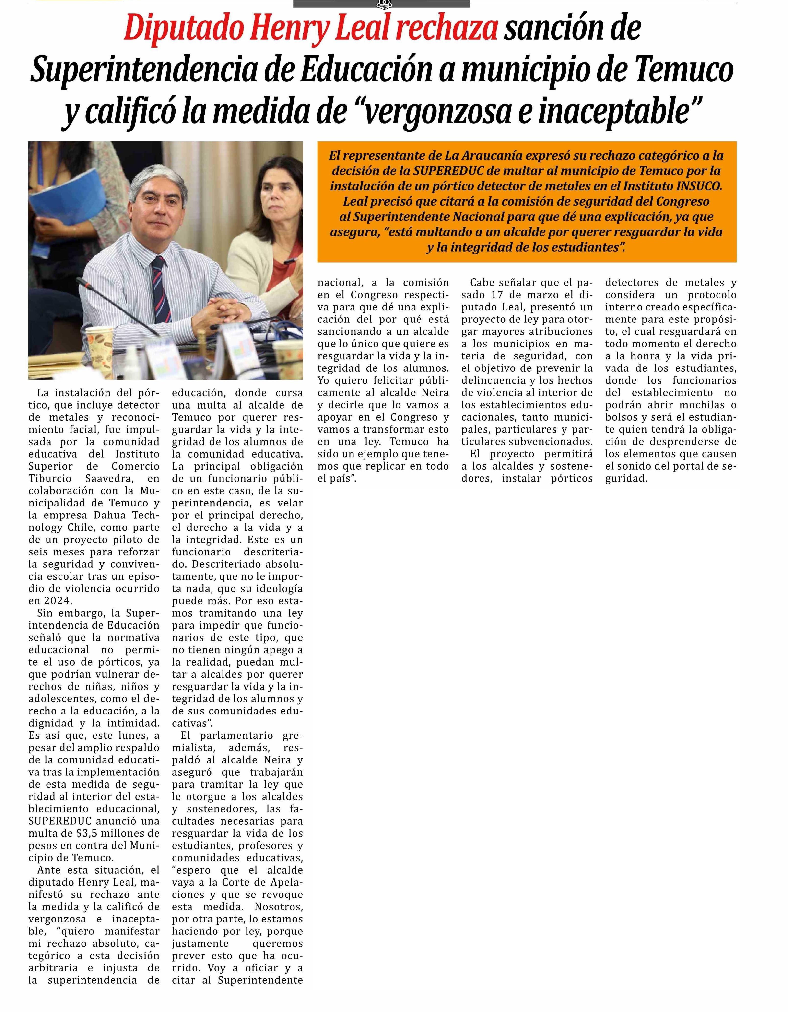 Diputado Henry Leal rechaza sanción de Superintendencia de Educación a municipio de Temuco y calificó la medida de “vergonzosa e inaceptable” 28-05-2025 Las Noticias |