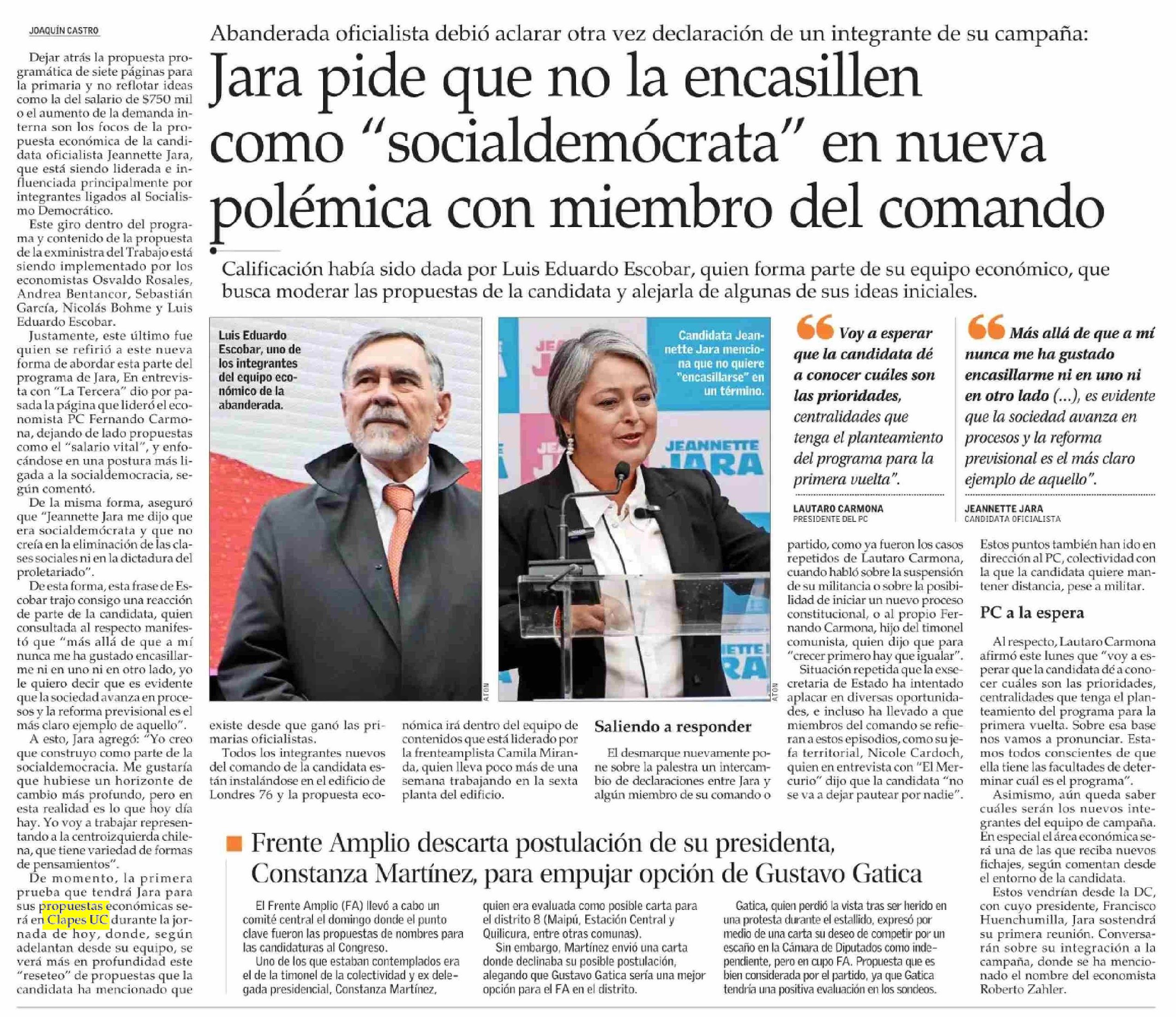 Jara pide que no la encasillen como “socialdemócrata” en nueva polémica con miembro del comando 05-08-2025 El Mercurio |