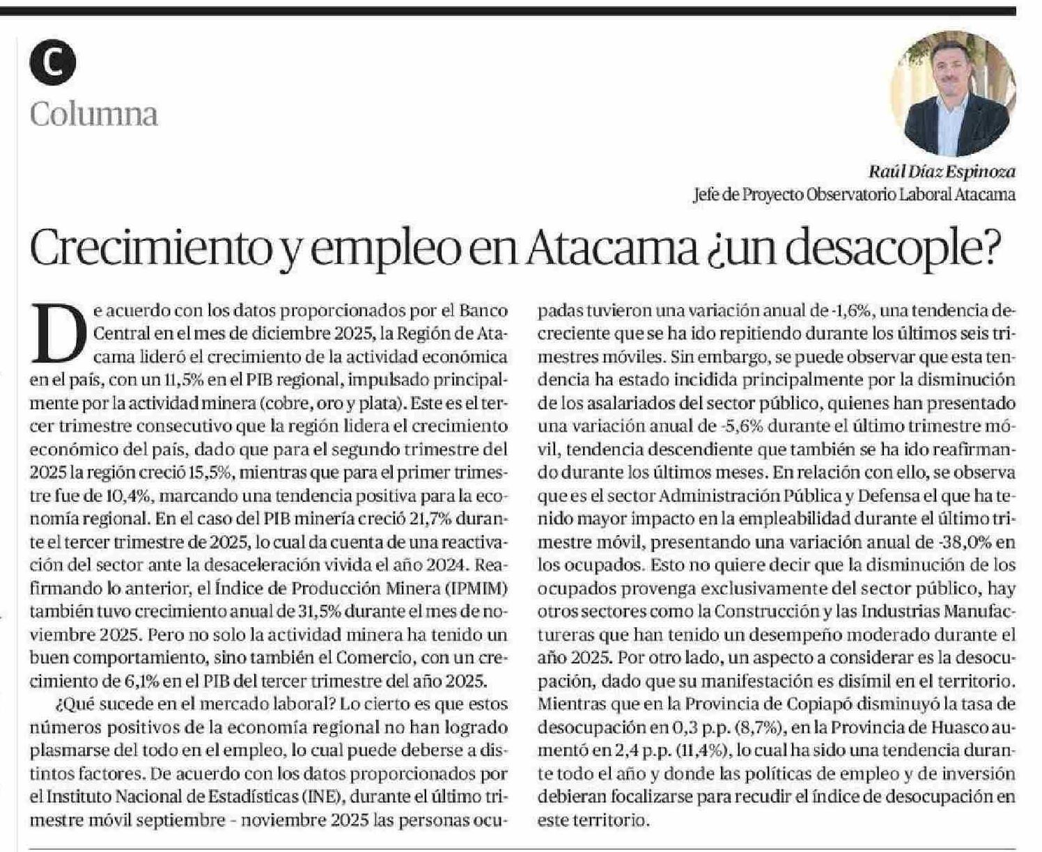 Columnas de Opinión: Crecimiento y empleo en Atacama ¿un desacople? 12-01-2026 El Diario de Atacama |