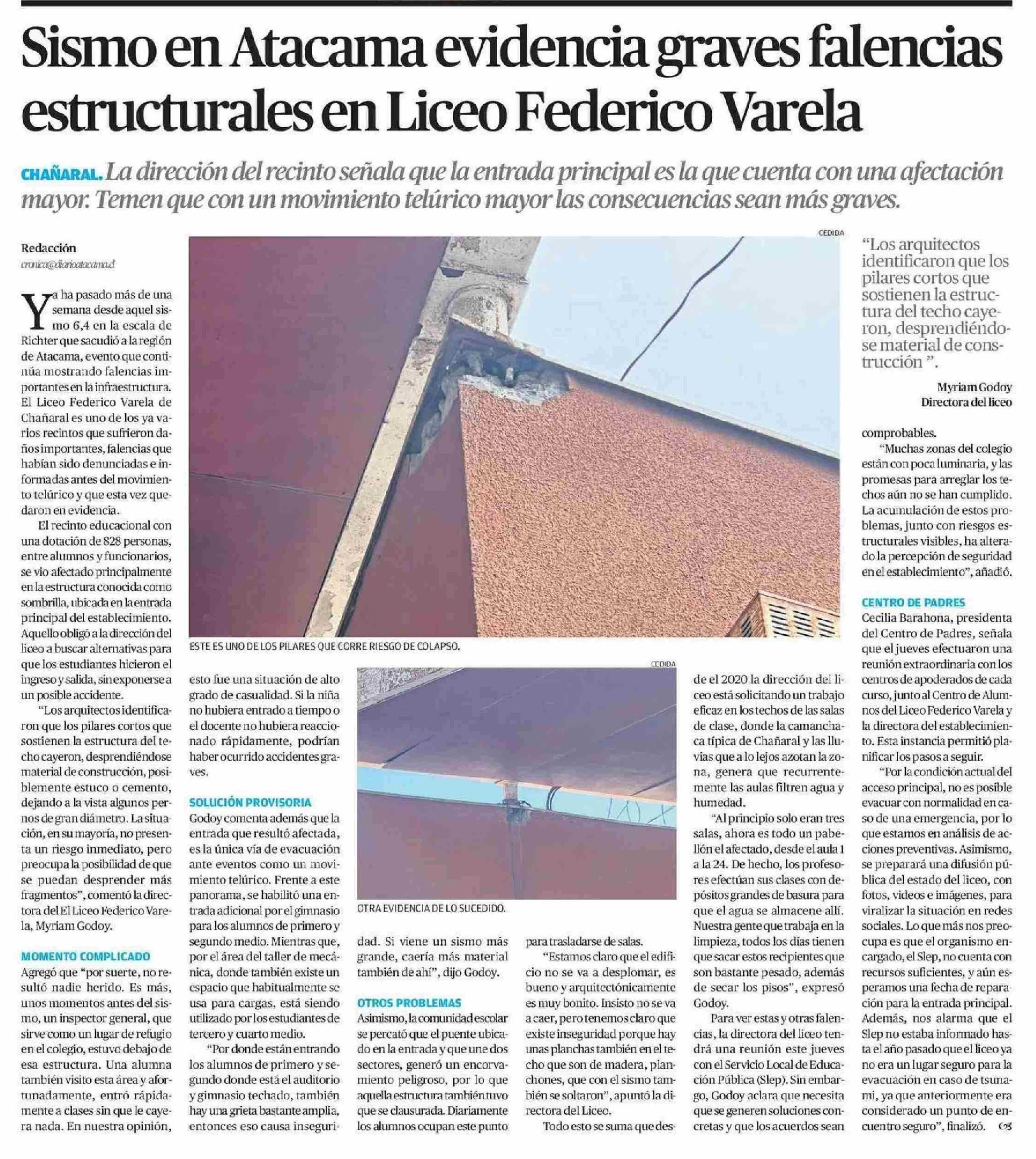 Sismo en Atacama evidencia graves falencias estructurales en Liceo Federico Varela 14-06-2025 El Diario de Atacama |
