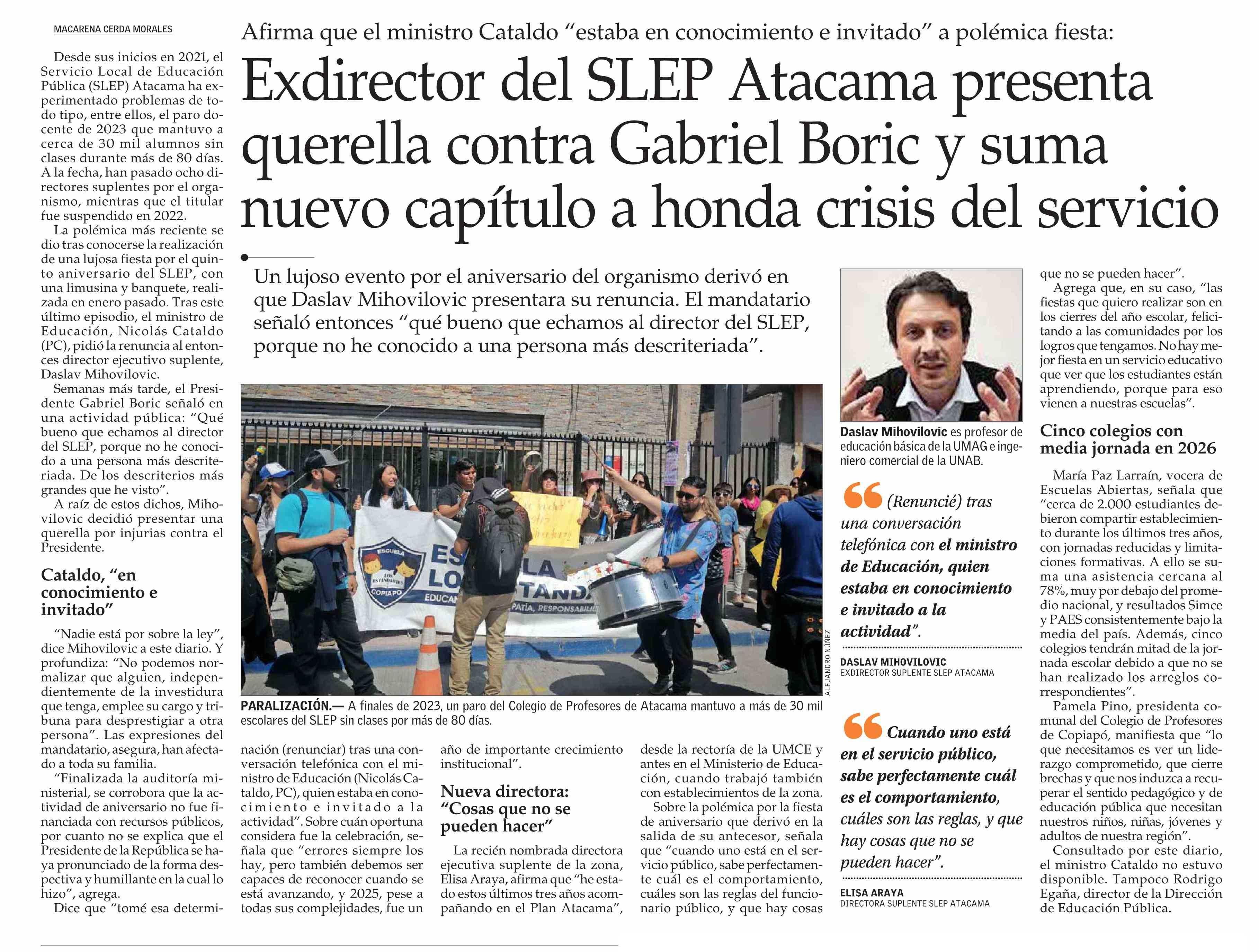 Exdirector del SLEP Atacama presenta querella contra Gabriel Boric y suma nuevo capítulo a honda crisis del servicio 04-03-2026 El Mercurio |