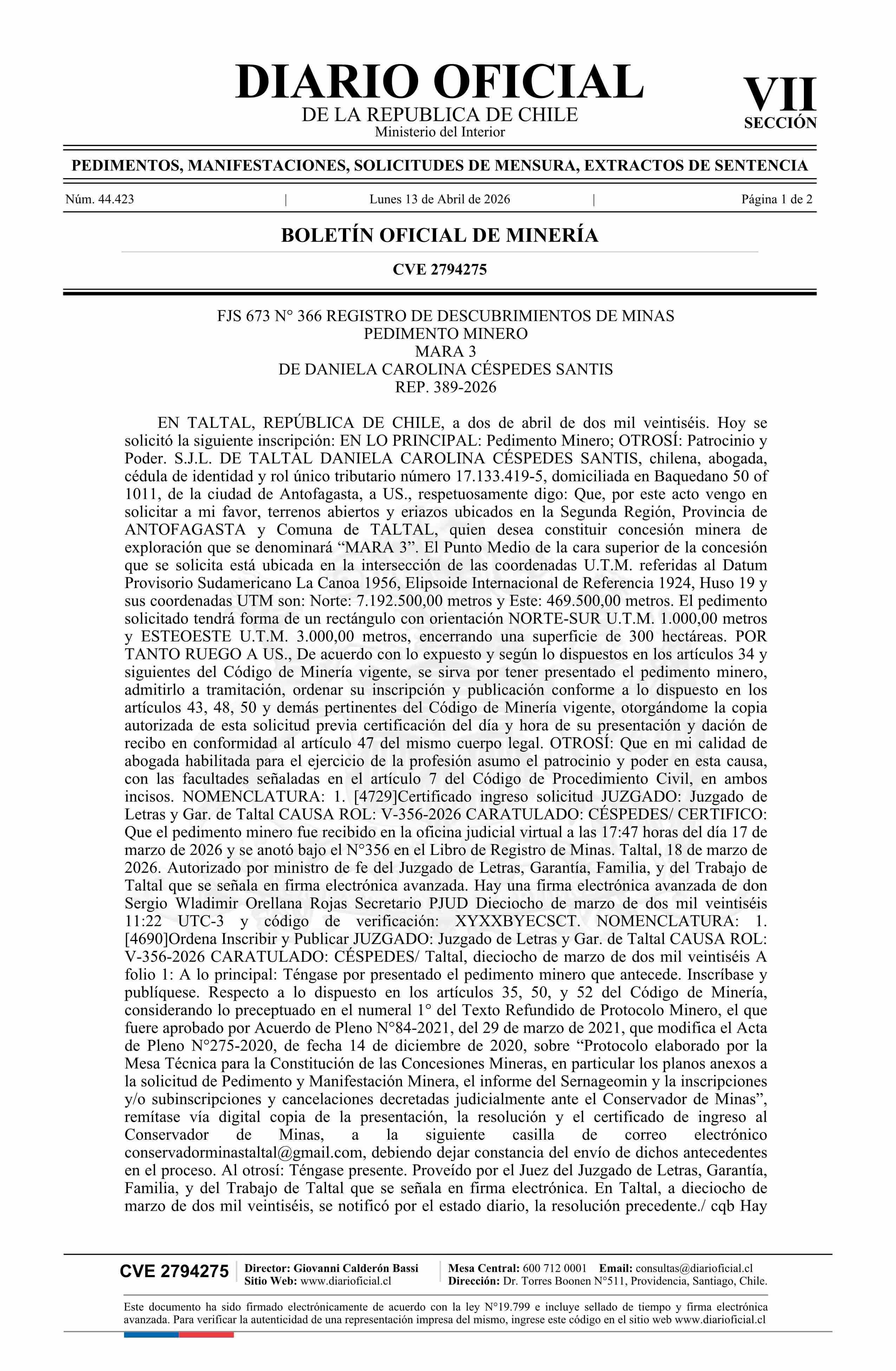 MARA 3 / Céspedes Santis Daniela Carolina 13-04-2026 DIARIO OFICIAL CHILE - BOLETÍN OFICIAL DE MINERÍA |