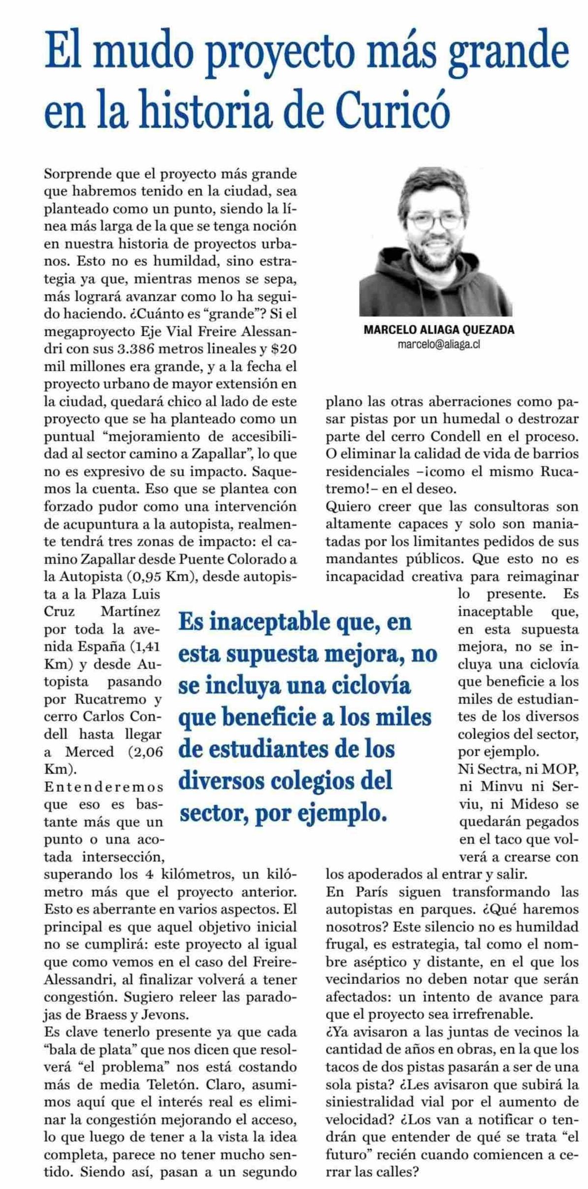 COLUMNAS DE OPINIÓN: El mudo proyecto más grande en la historia de Curicó 29-05-2025 La Prensa de Curicó |