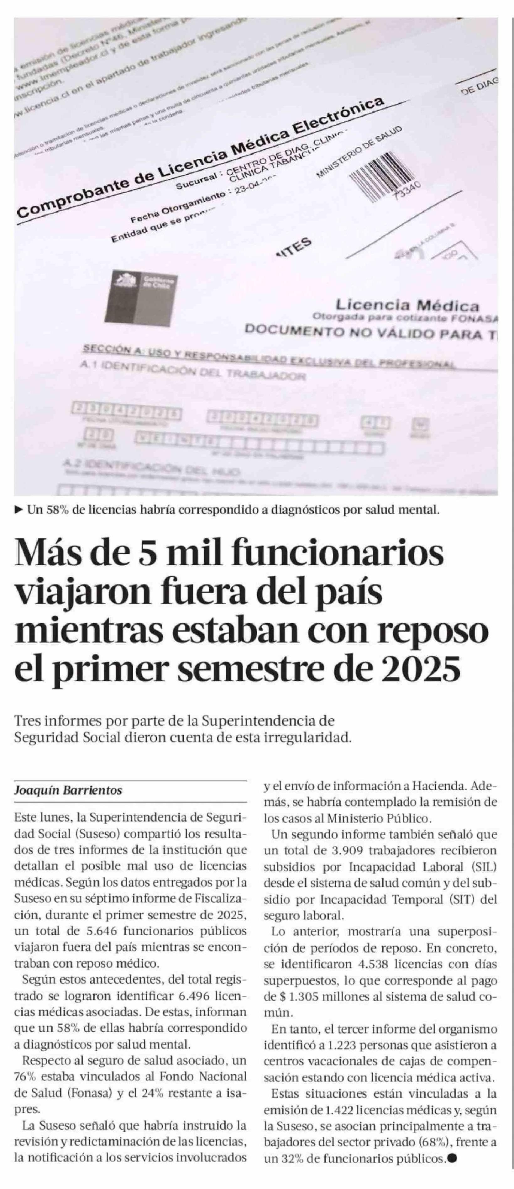 Más de 5 mil funcionarios viajaron fuera del país mientras estaban con reposo el primer semestre de 2025 21-04-2026 La Tercera |