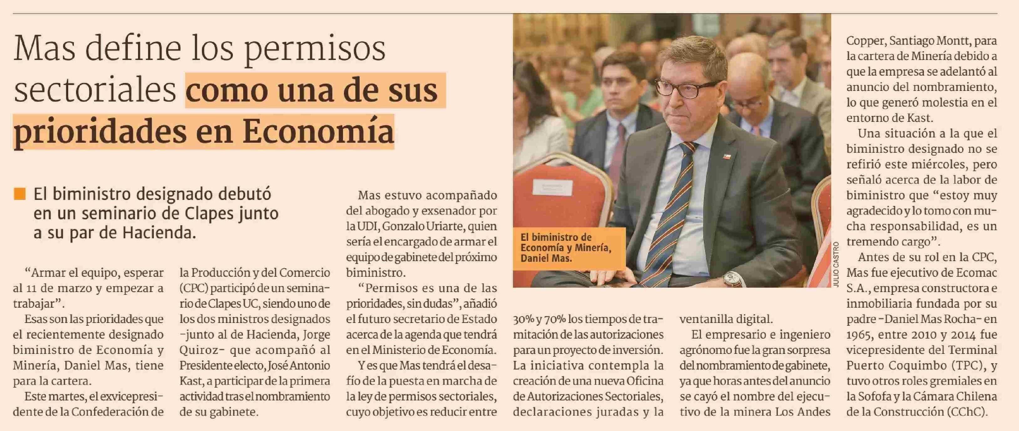 Mas define los permisos sectoriales como una de sus prioridades en Economía 22-01-2026 Diario Financiero |