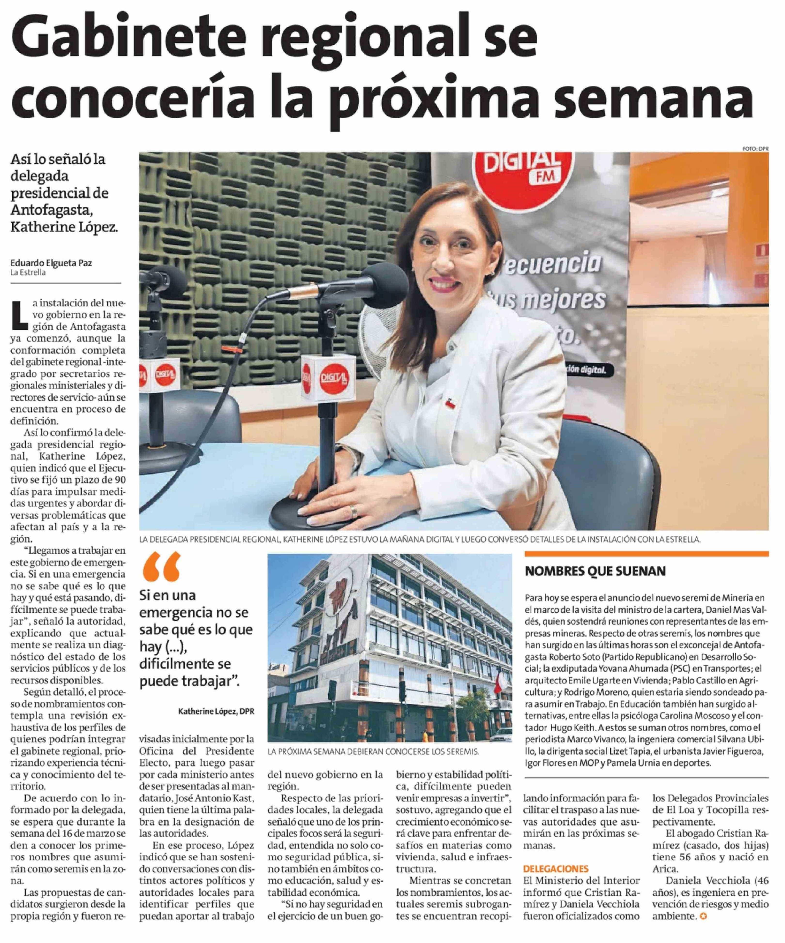 Gabinete regional se conocería la próxima semana 13-03-2026 La Estrella de Antofagasta |