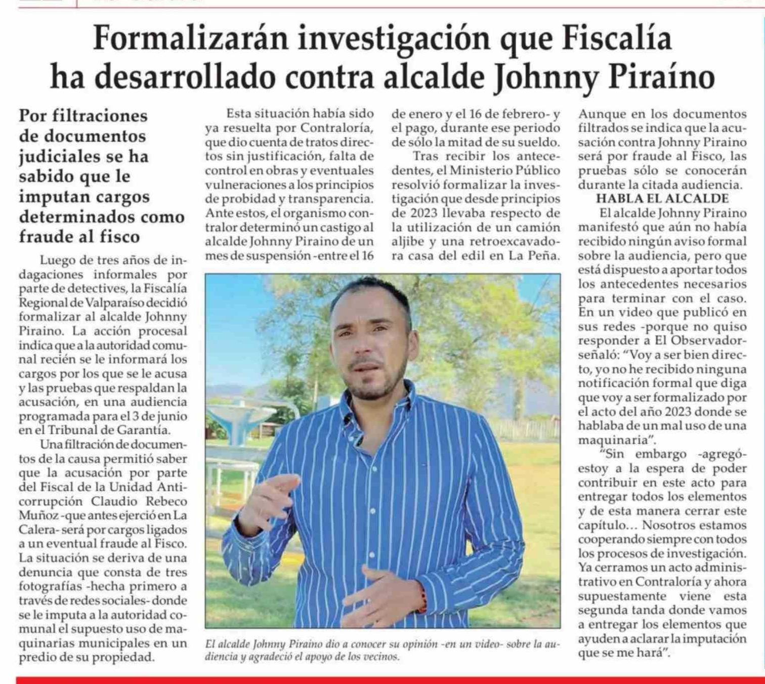 Formalizarán investigación que Fiscalía ha desarrollado contra alcalde Johnny Piraíno 10-04-2026 El Observador |
