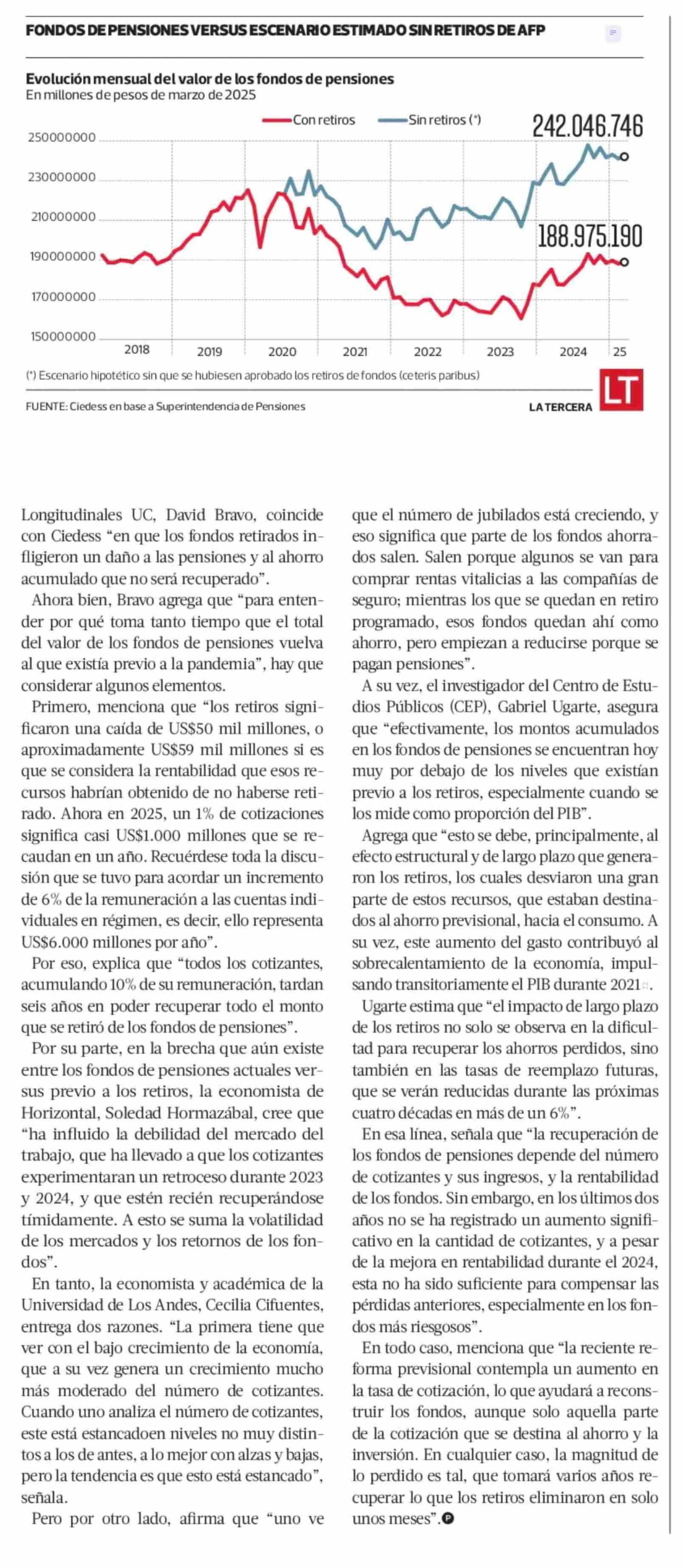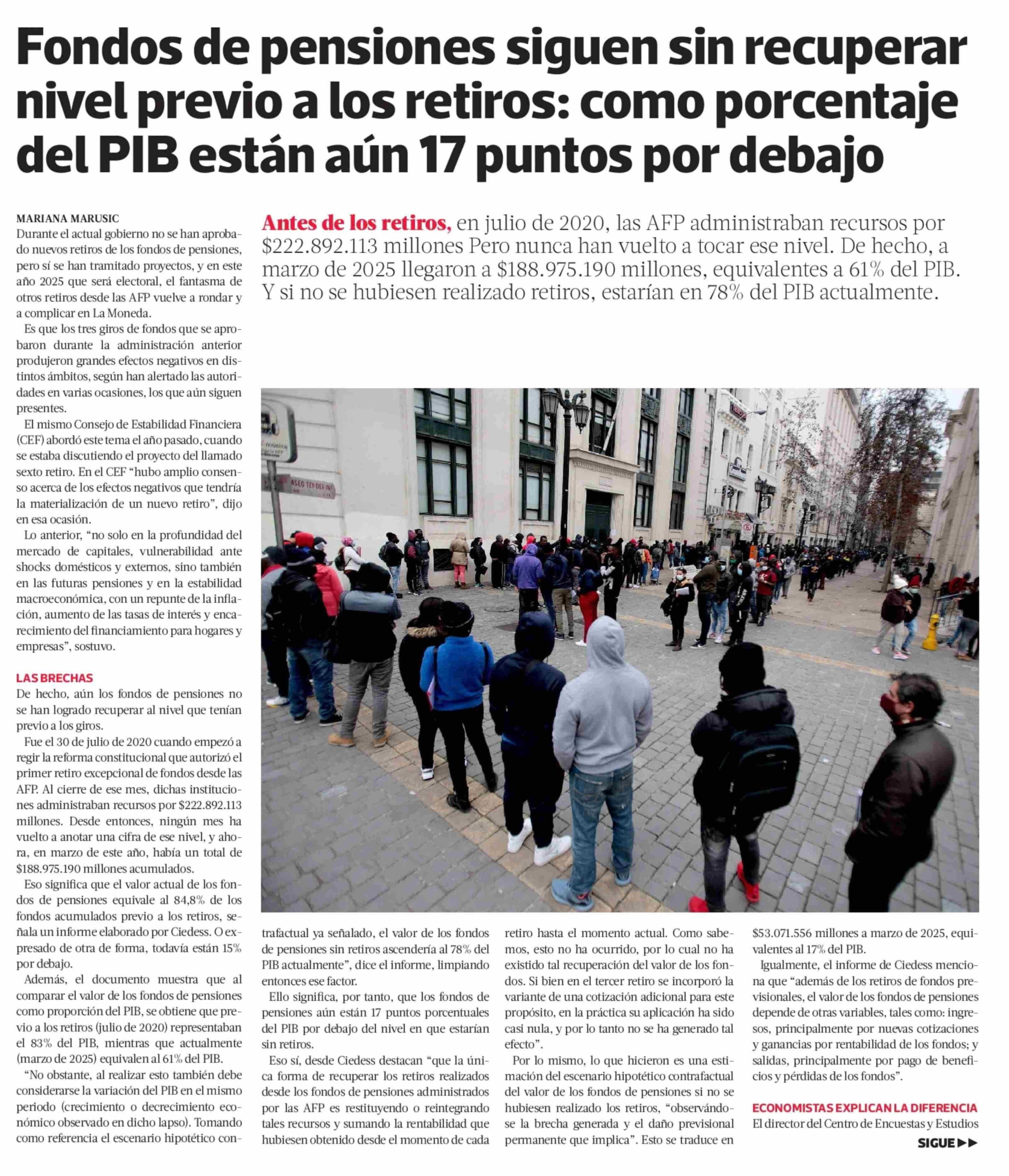 Fondos de pensiones siguen sin recuperar nivel previo a los retiros: como porcentaje del PIB están aún 17 puntos por debajo 24-04-2025 La Tercera |