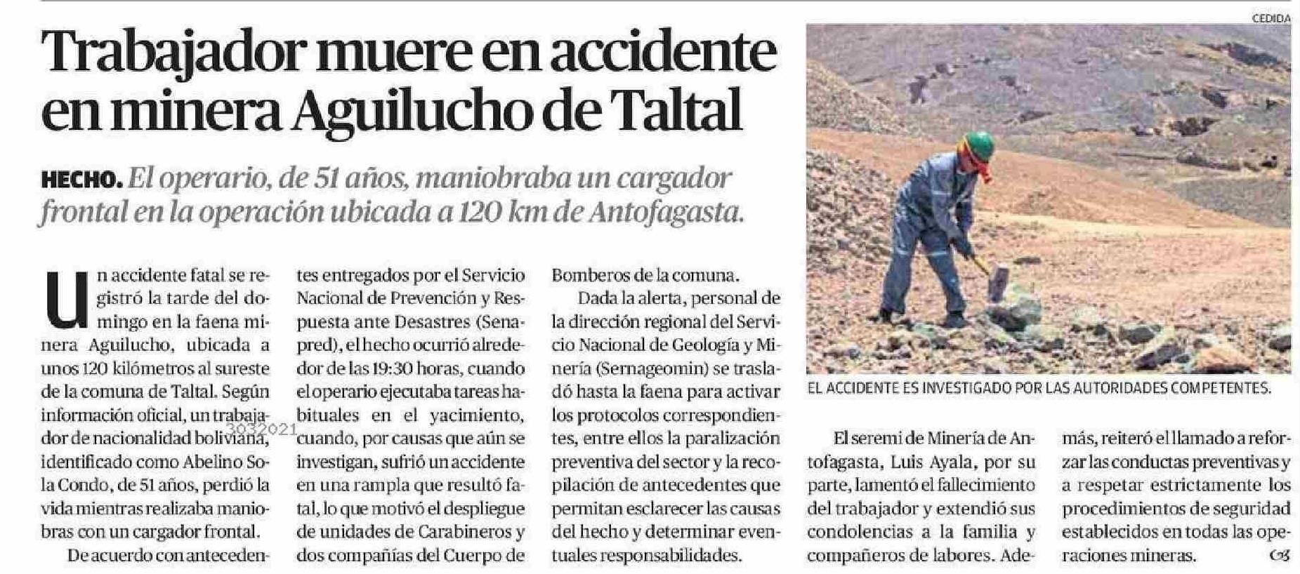 | Título: | Trabajador muere en accidente en minera Aguilucho de Taltal |