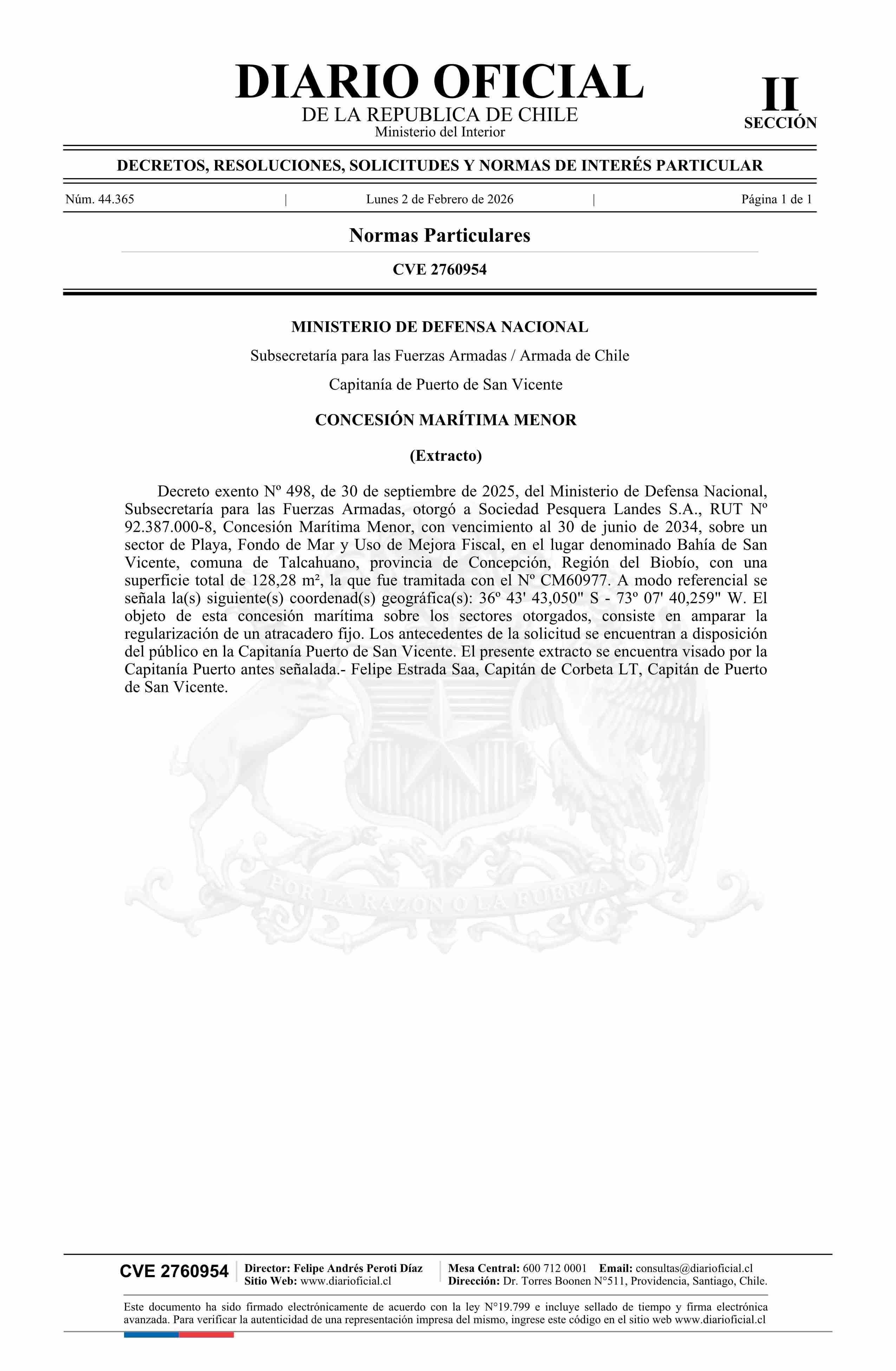 Extracto de decreto exento número 498, de 2025.- Concesión marítima menor 02-02-2026 Diario Oficial Edición Electrónica |