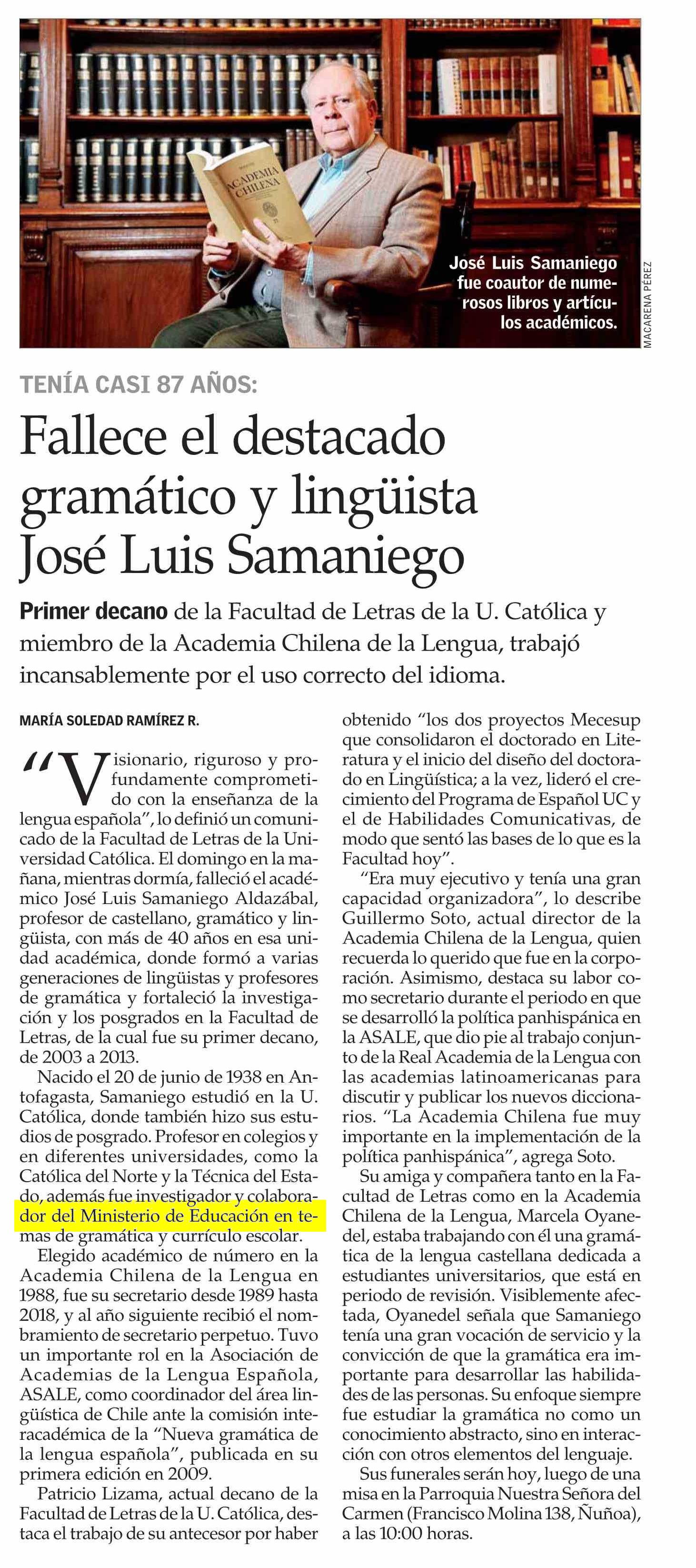 Fallece el destacado gramático y lingüista José Luis Samaniego 17-06-2025 El Mercurio |