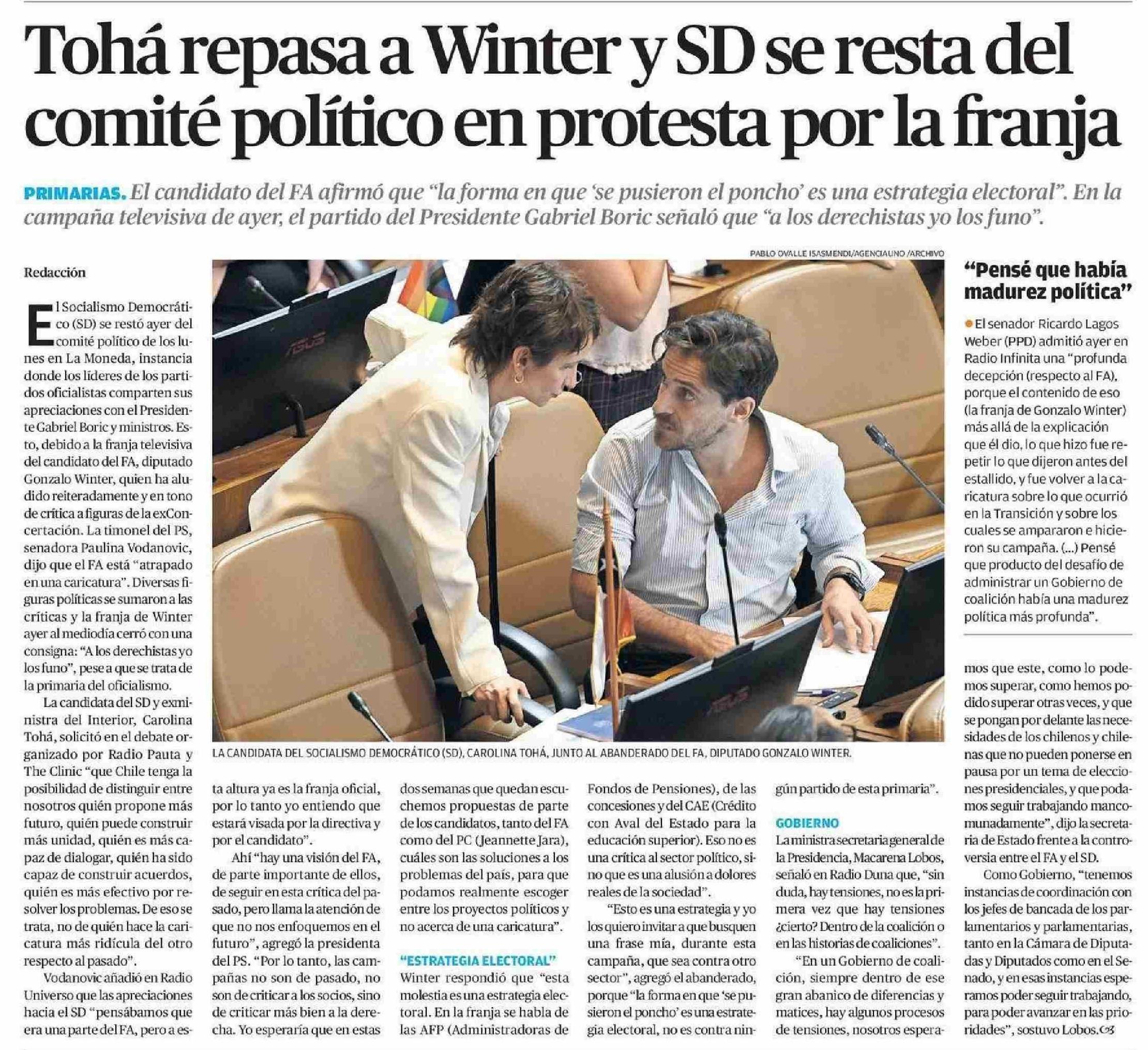 | Título: | Tohá repasa a Winter y SD se resta del comité político en protesta por la franja |